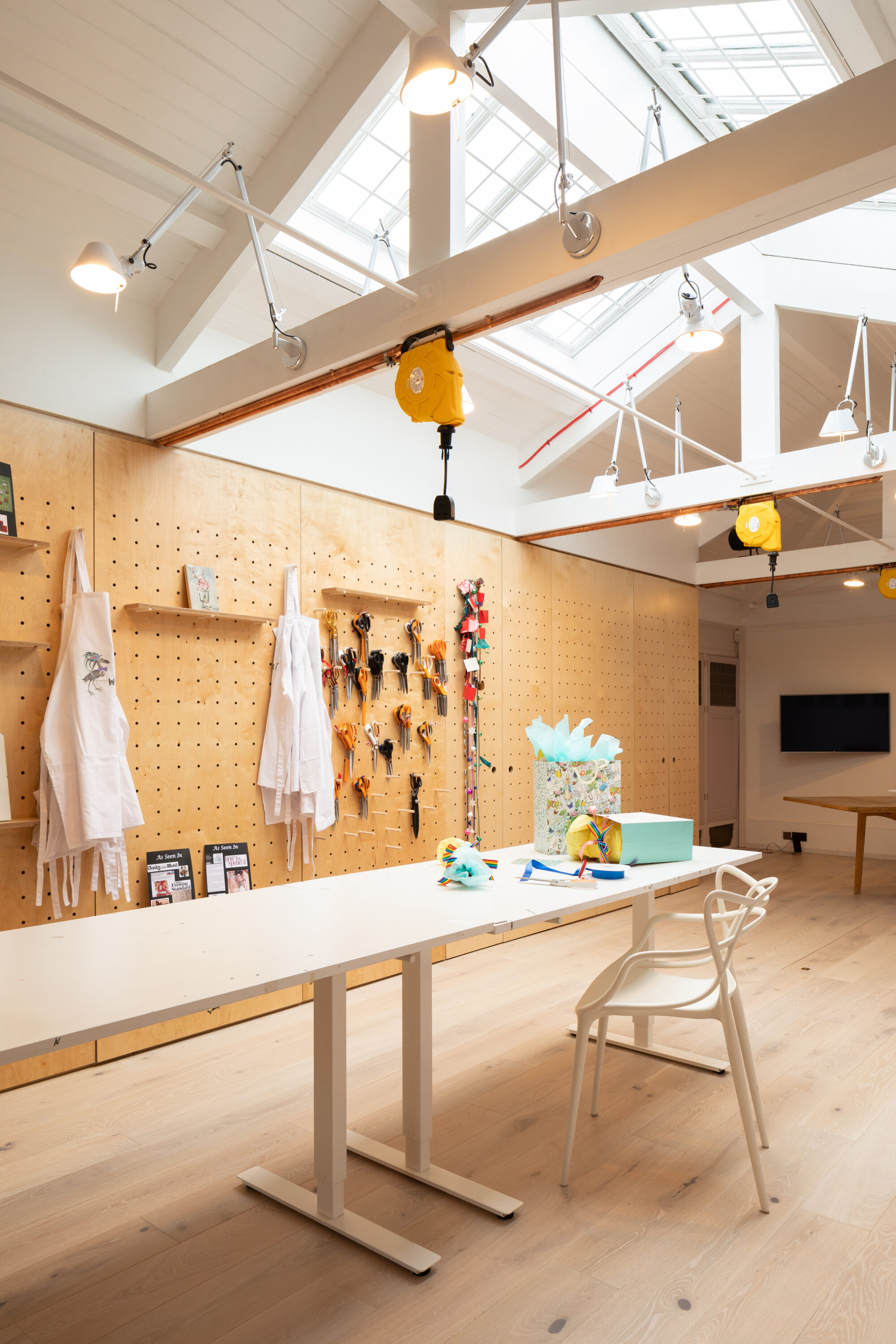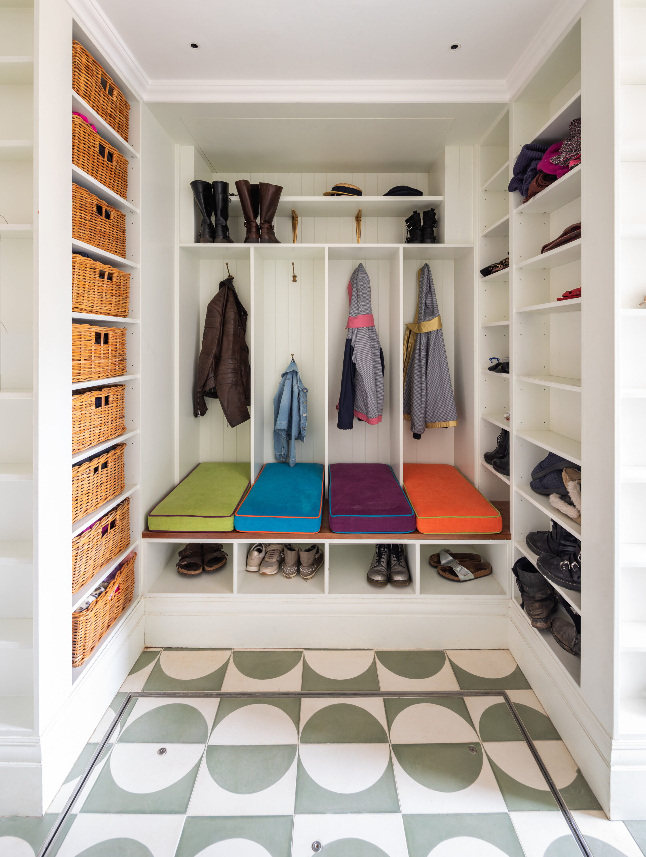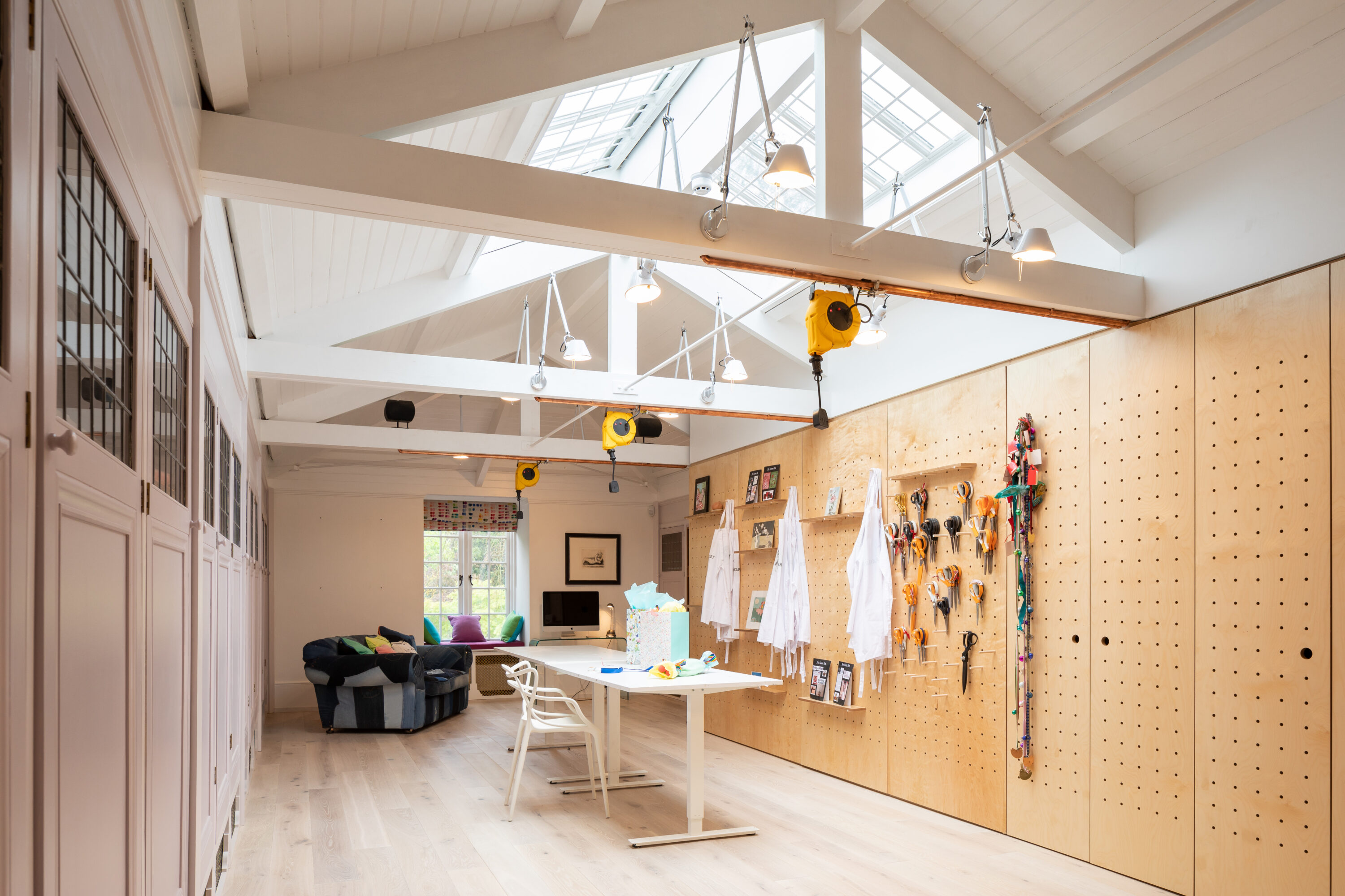 The boot room caters for hectic family life with various sized cubbies to store plenty of shoes and coats. In an annex studio space, we created a pegboard wall and storage from Birch Ply to service the client’s business needs.