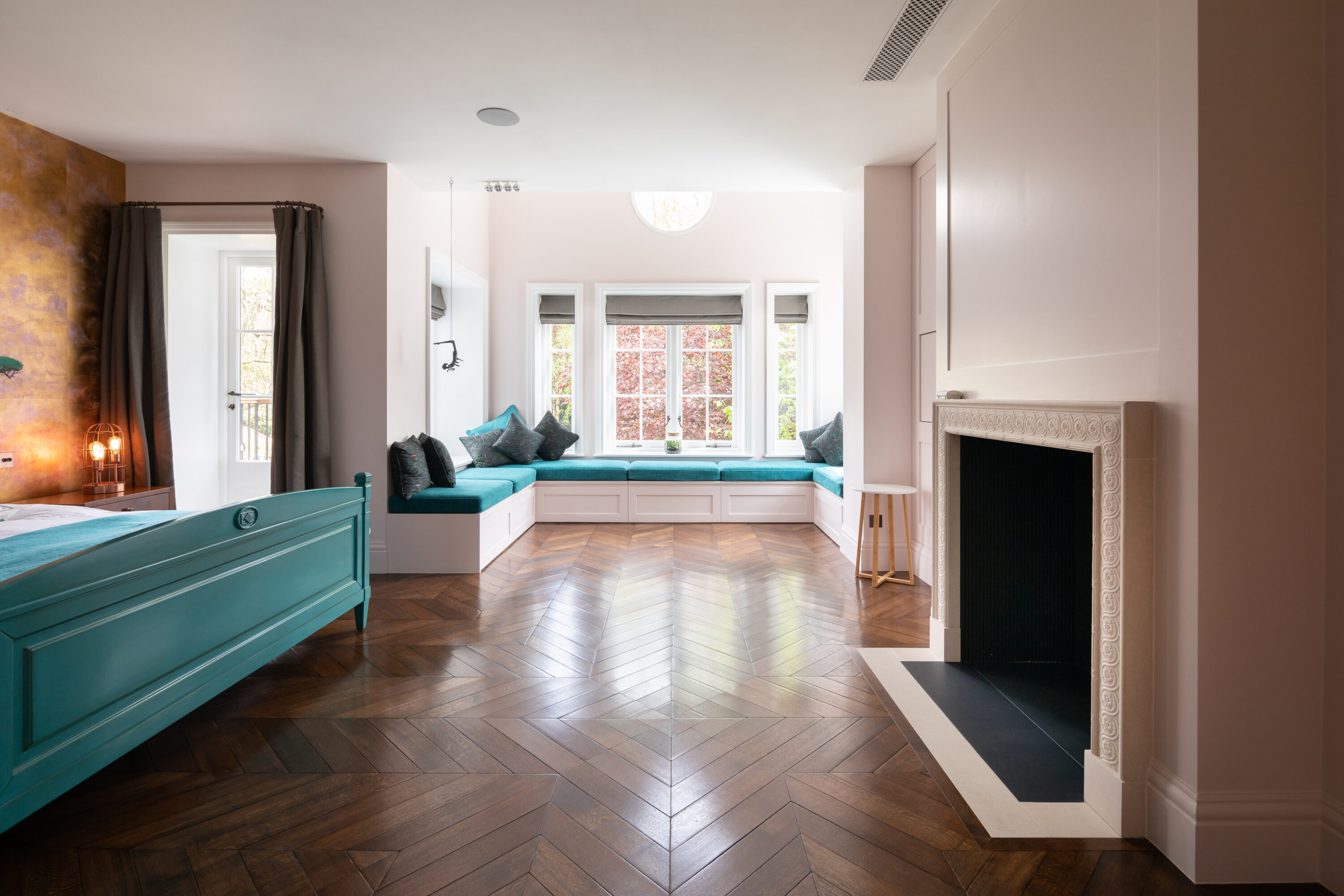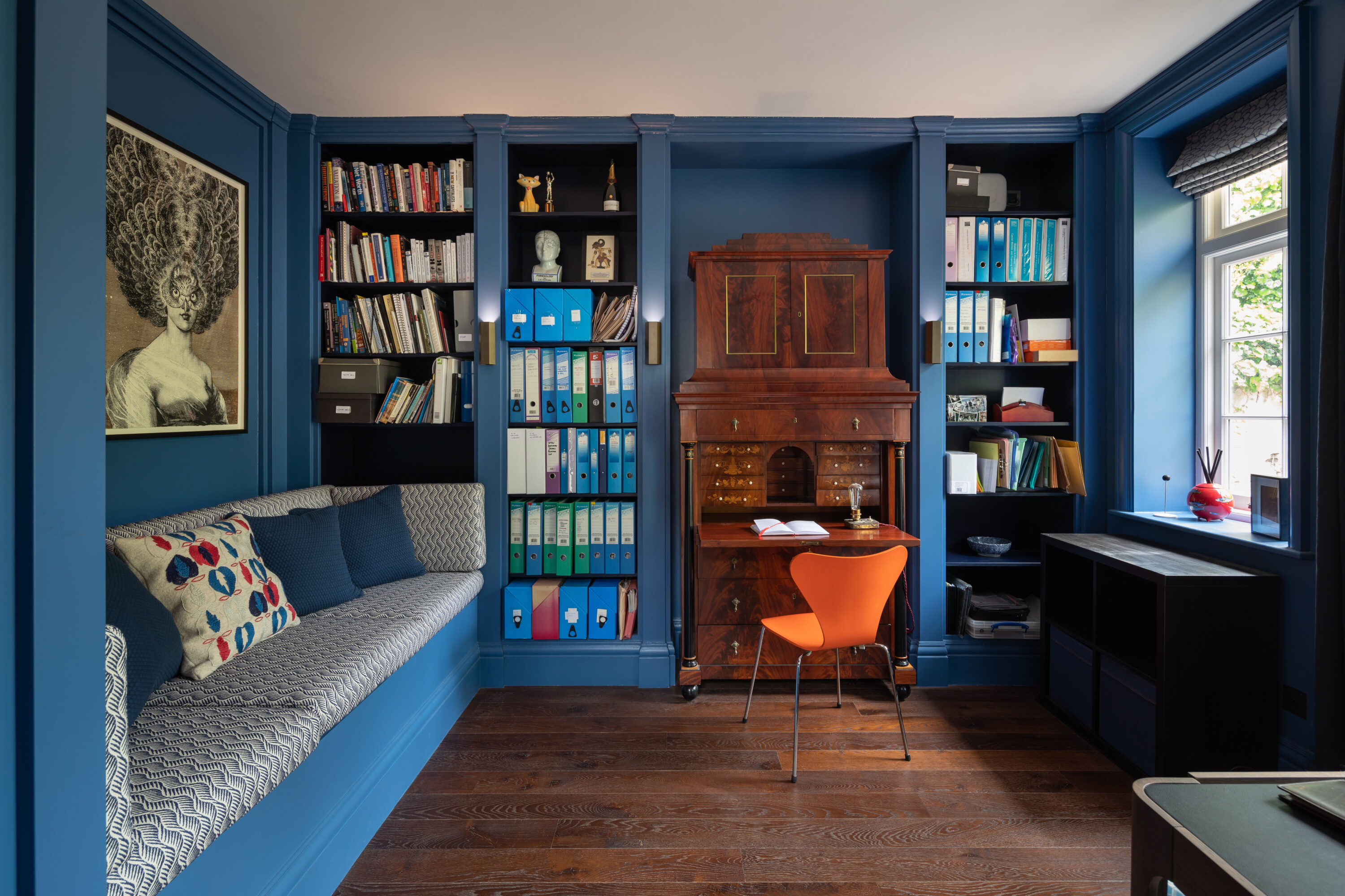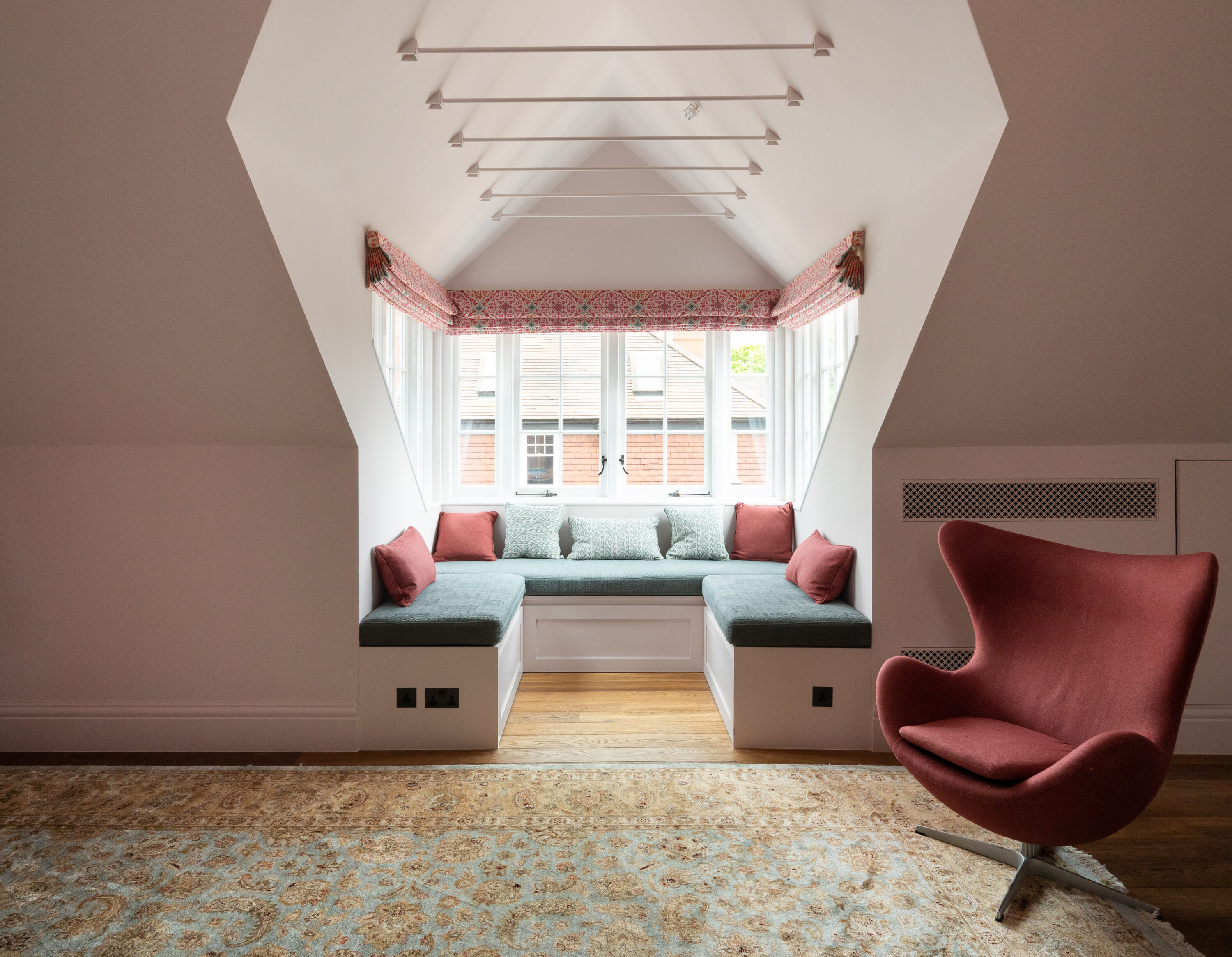 A recessed window bench seat sits opposite, complementing the bold colour choice used elsewhere in the room and offering a peaceful spot for reading and reflection.