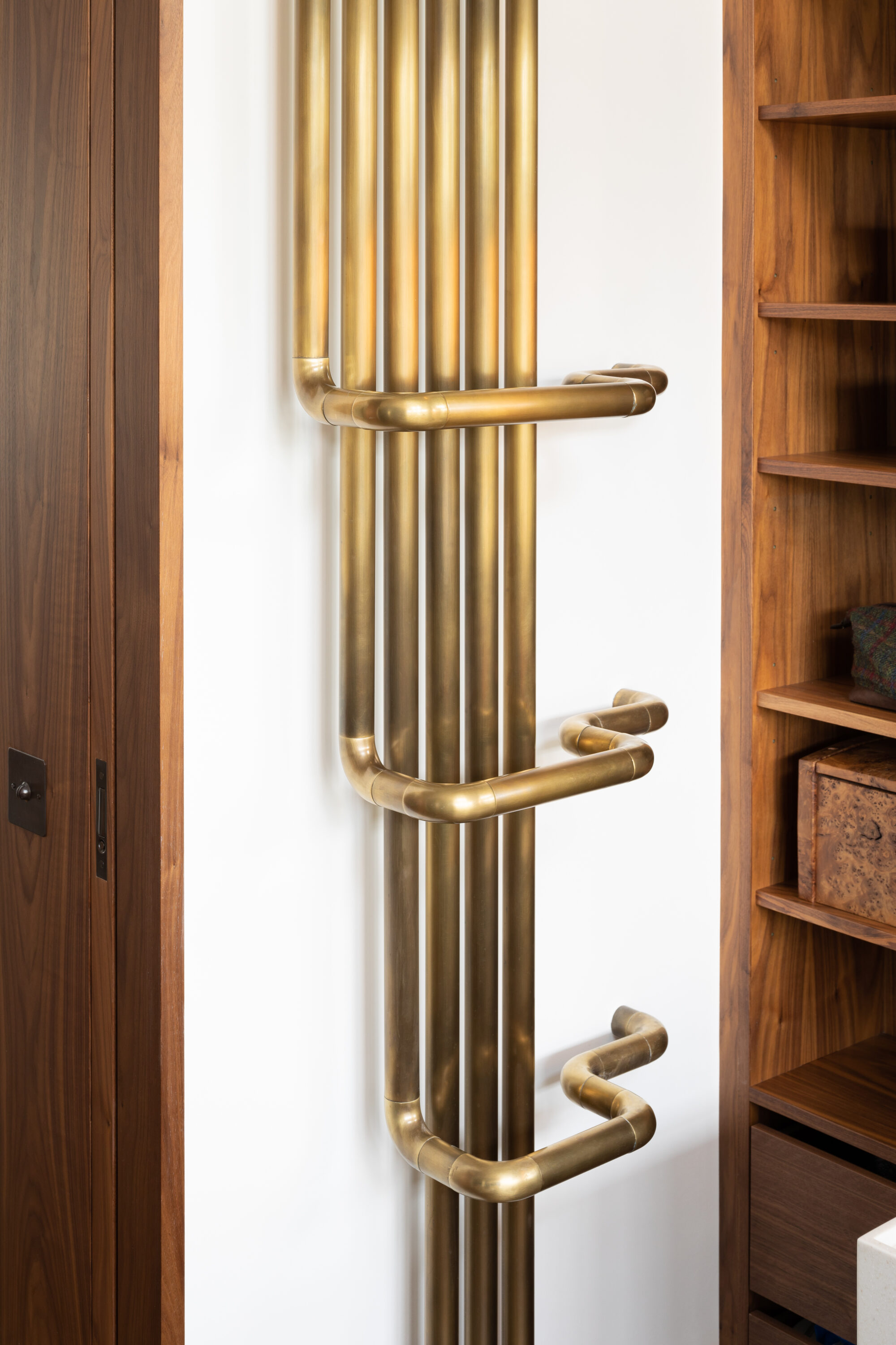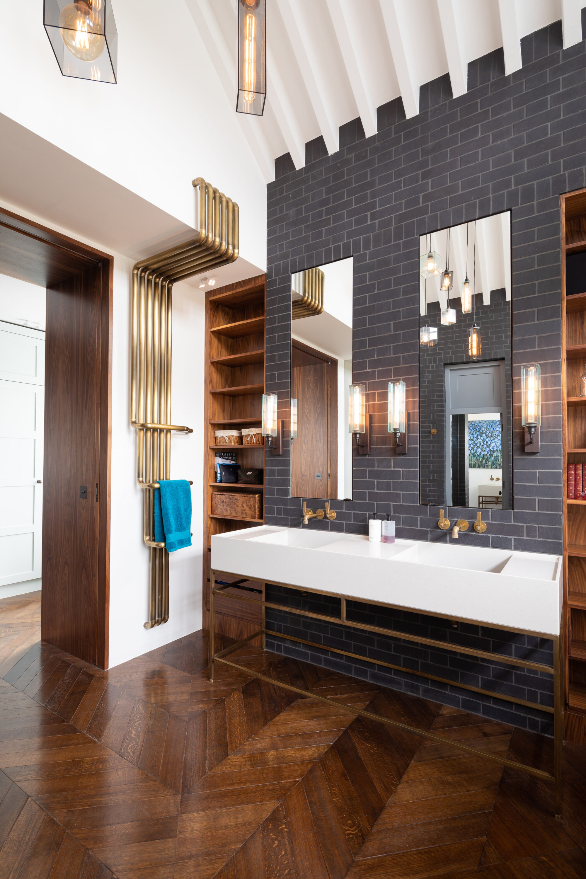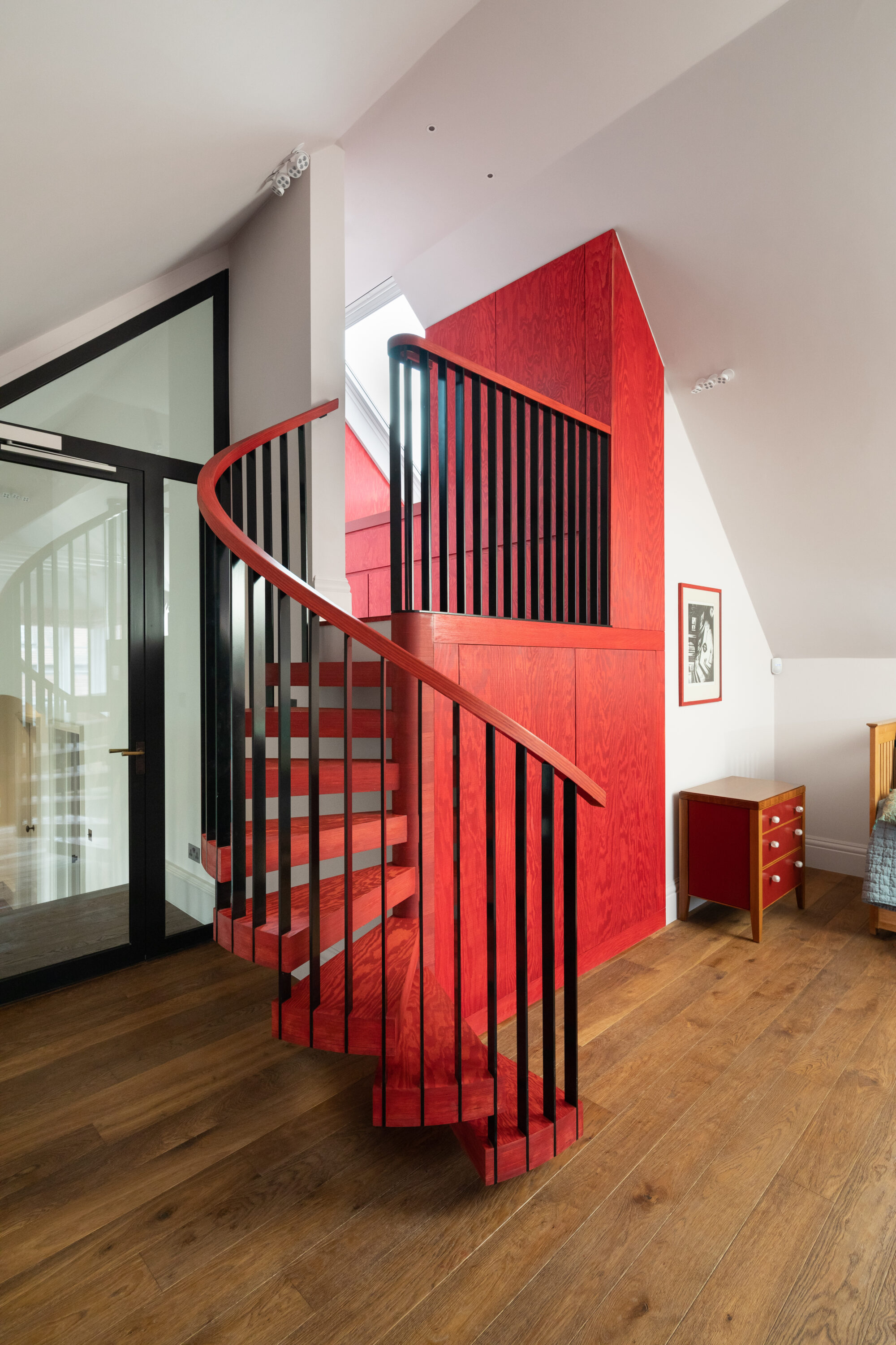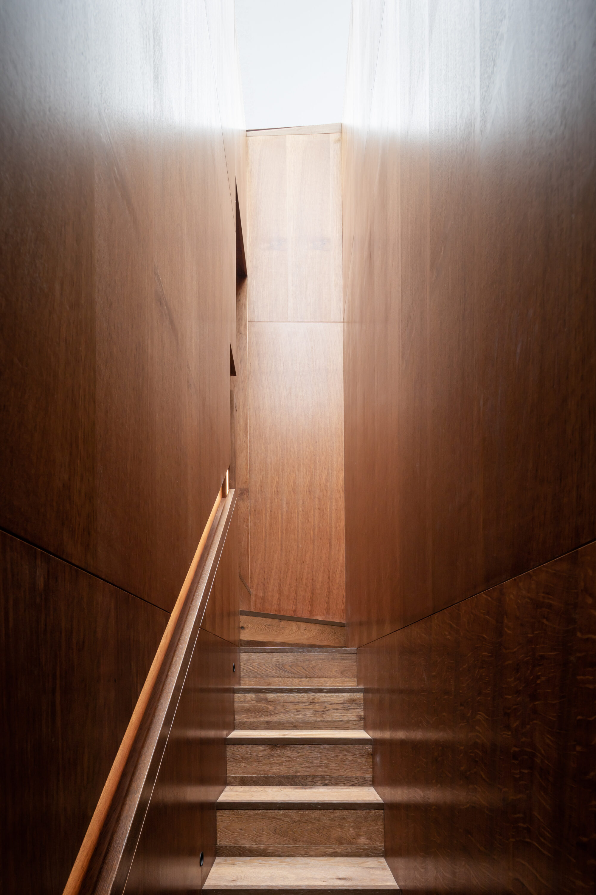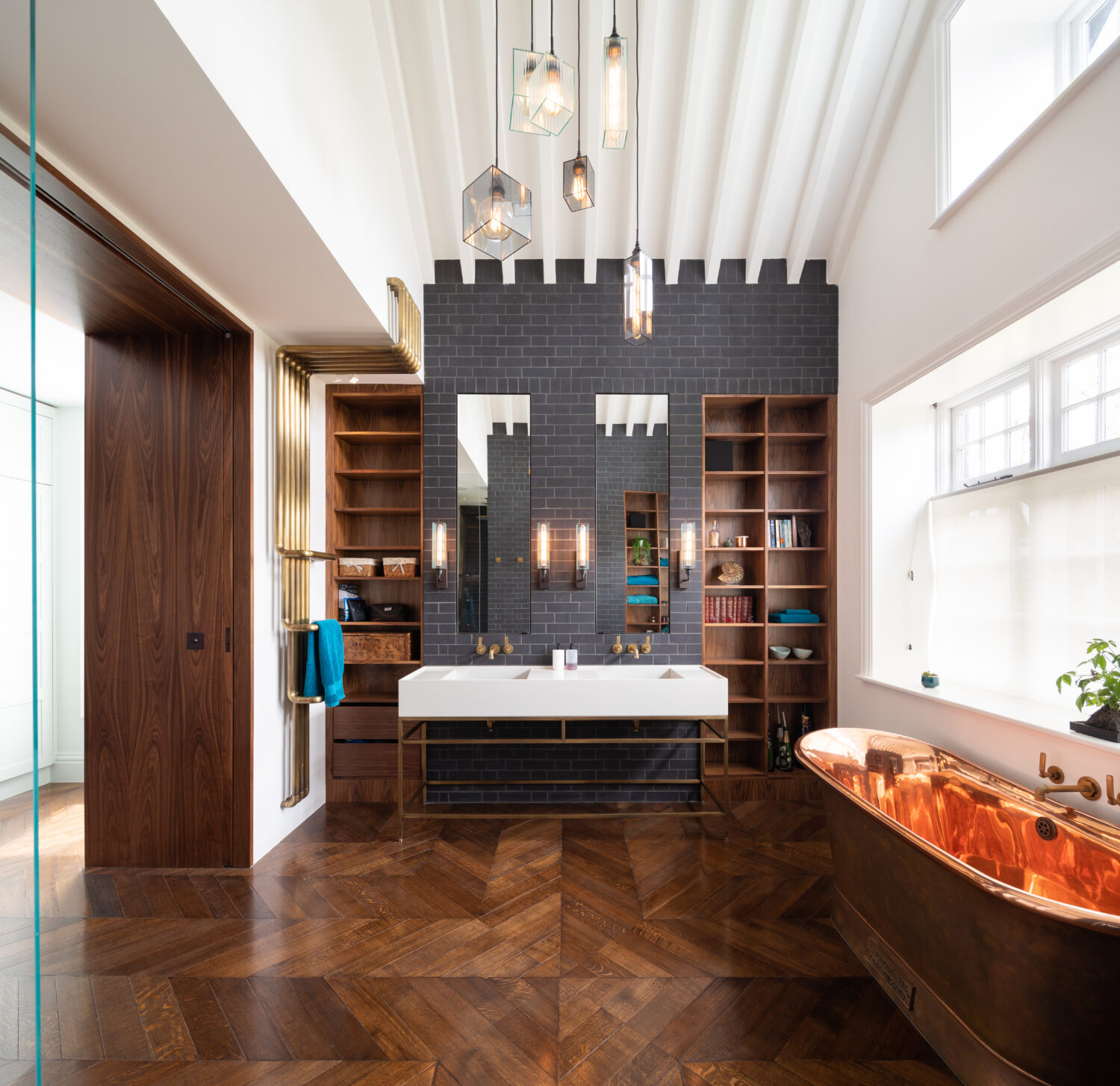At the top of the house, space is maximised with a mezzanine level accommodating a feature bathroom space. We created this impressive addition with red Linseed oiled Douglas Fir and custom ironmongery.