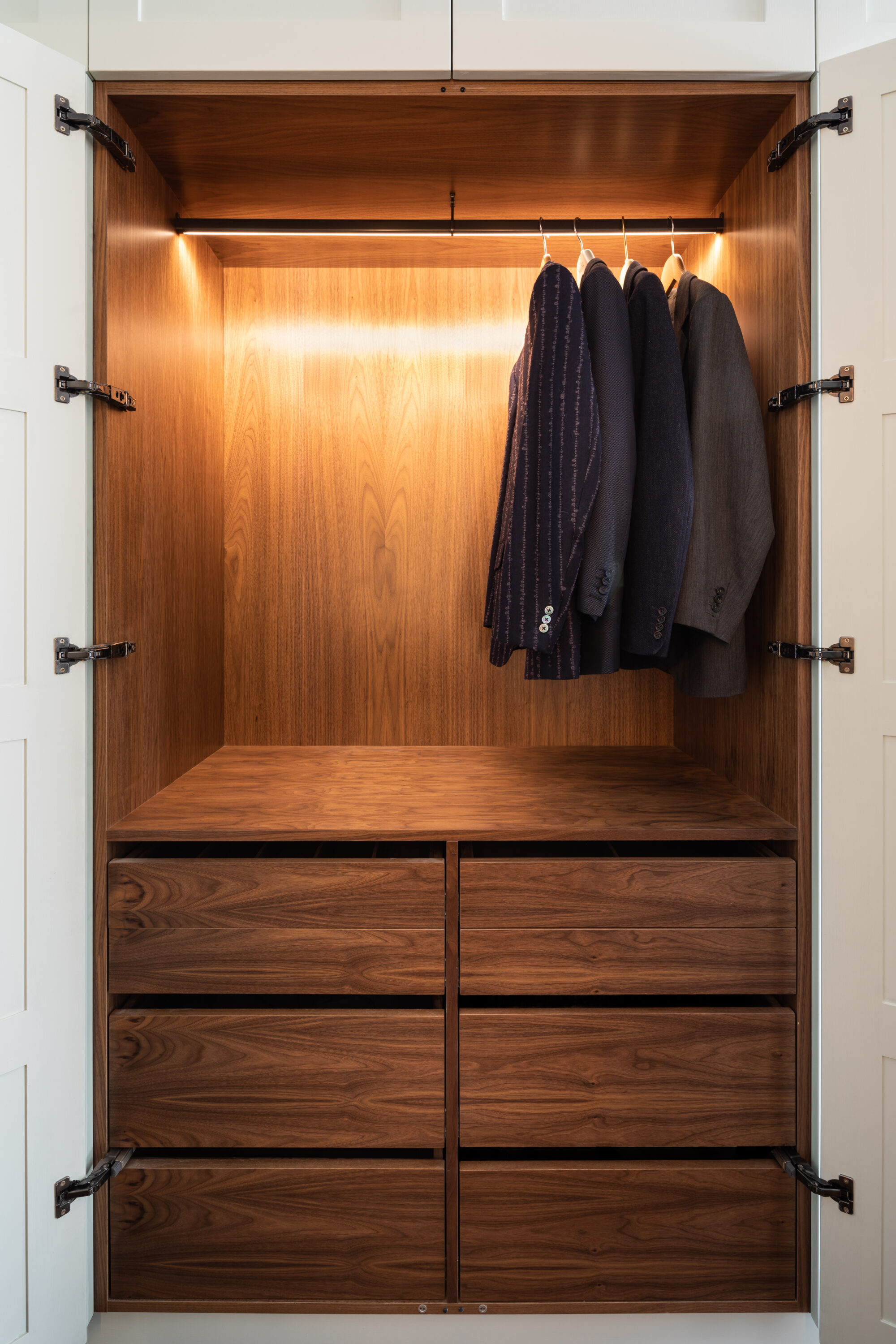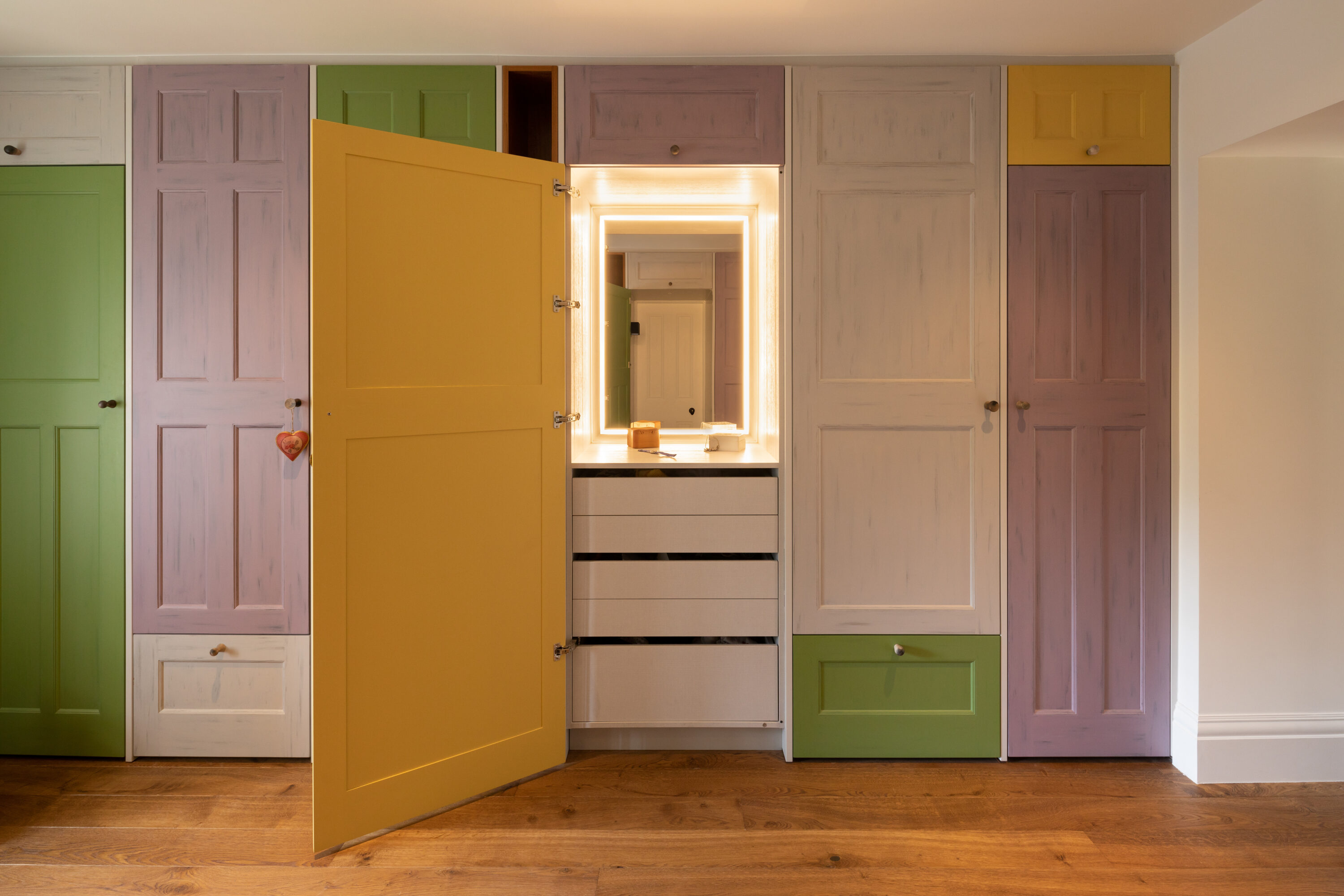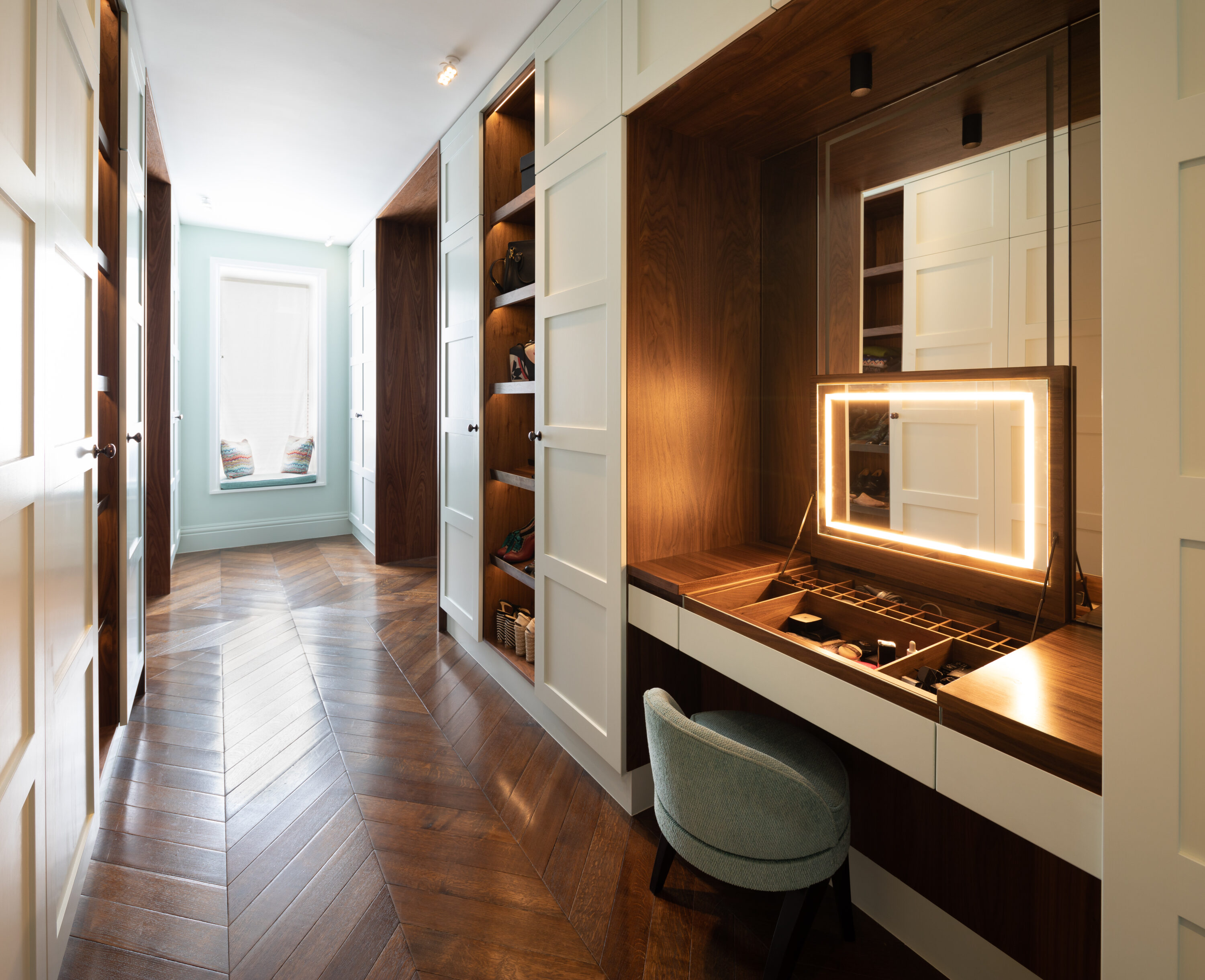 Continuing the playful theme, the children’s dressing room features a multitude of distressed sprayed doors complemented by smoked ceramic handles. Two of these leads to their respective bedrooms, the others opening to reveal dressing tables and wardrobes, all lit by accent recessed LED lighting.