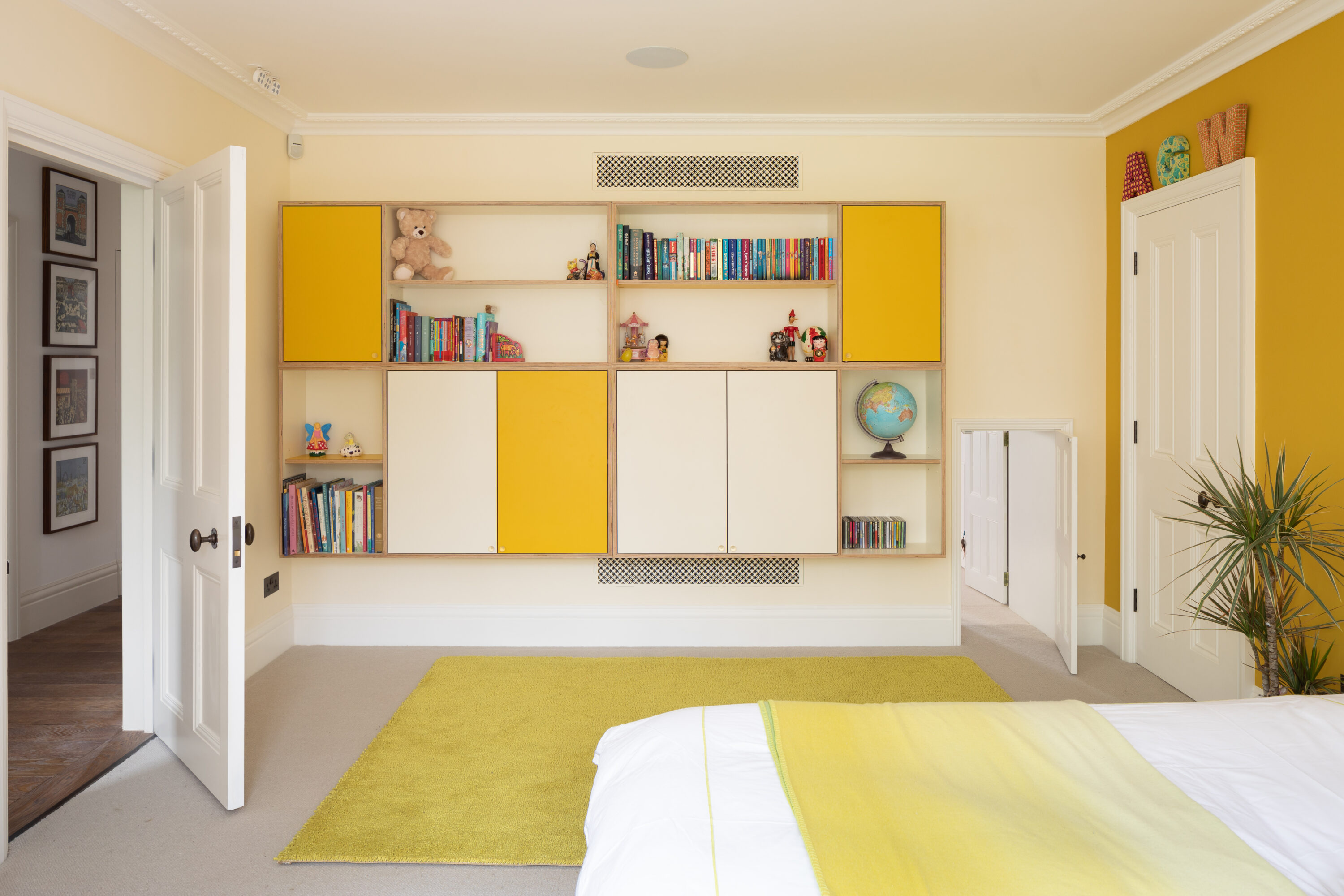A floating cabinet utilising Altofina laminate bonded to Birch Ply forms a colourful and practical storage unit in one of the bedrooms.