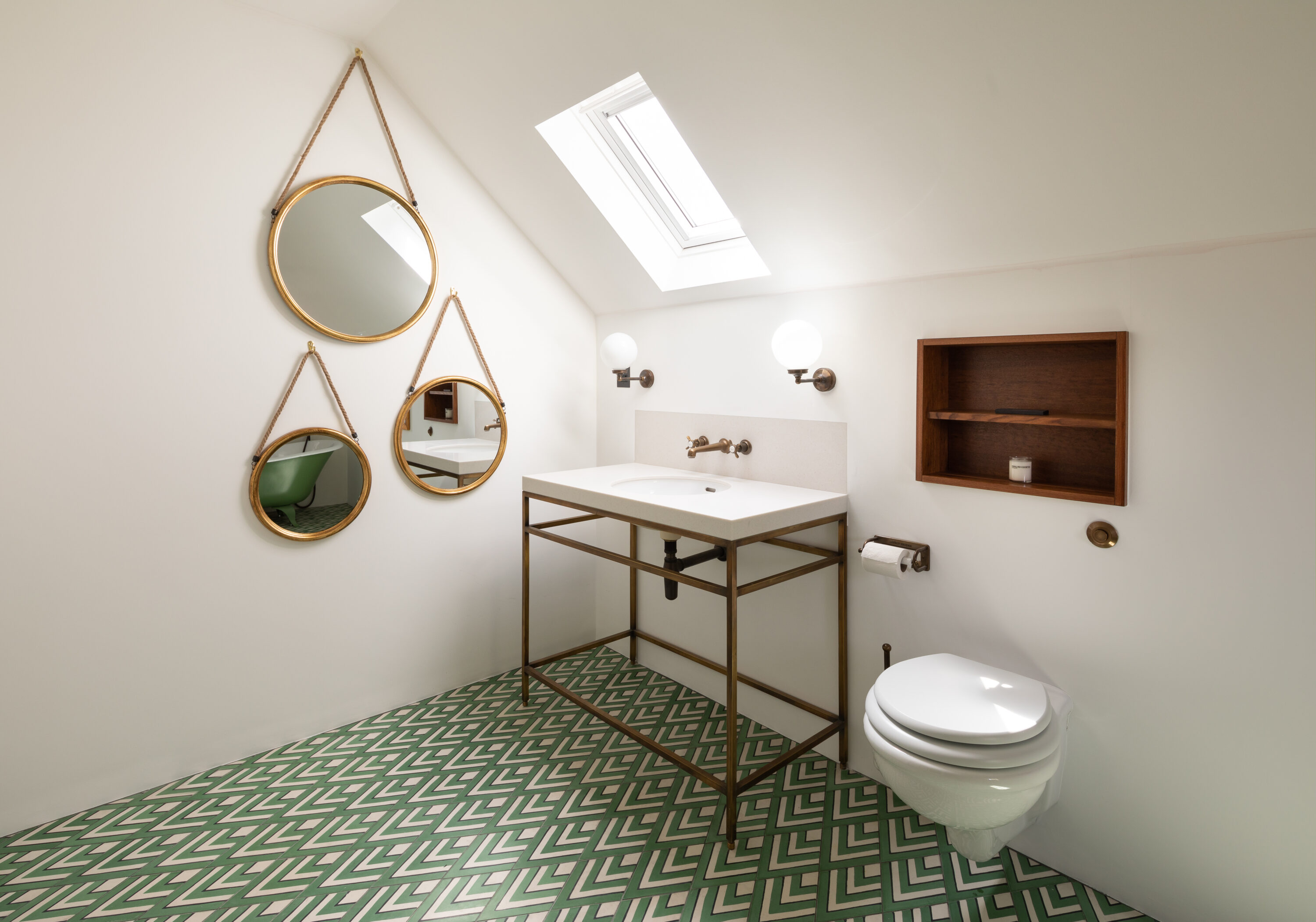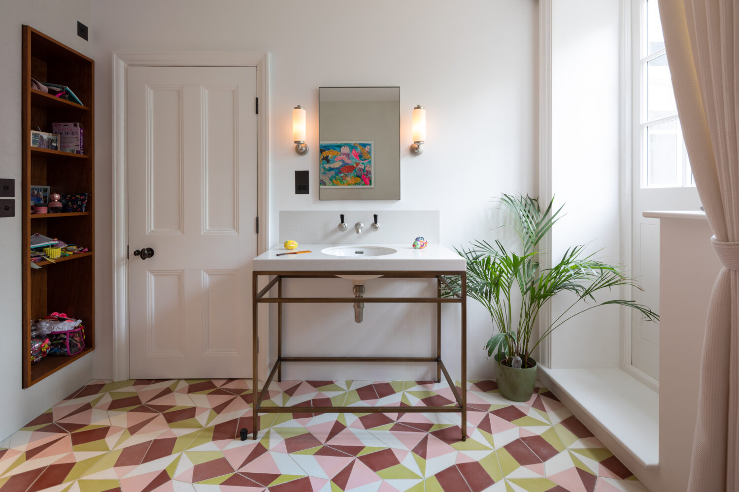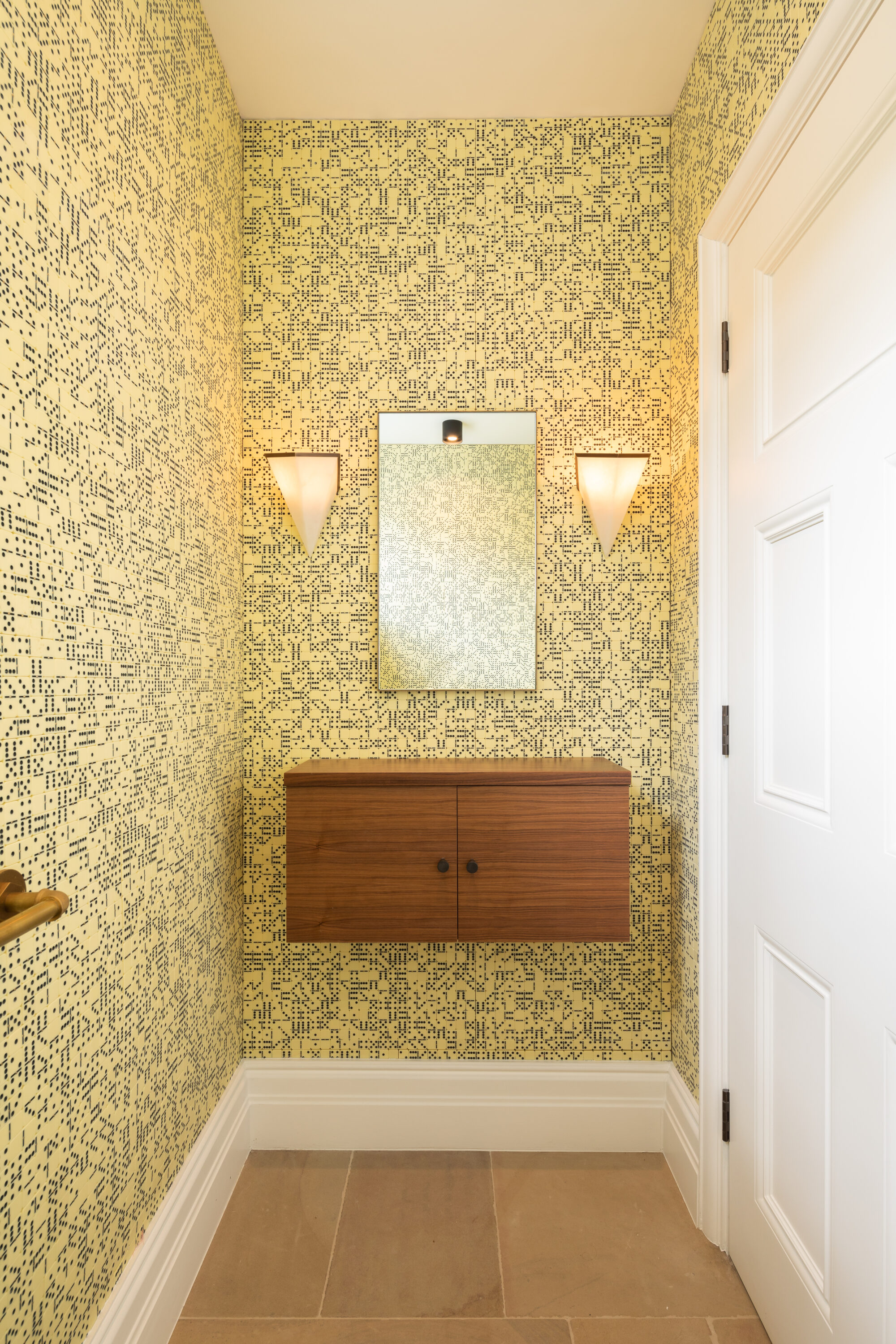 In the cloakroom, a pared-back AB Walnut vanity complements the unique wall tiling created from dominoes and feature wall lights.