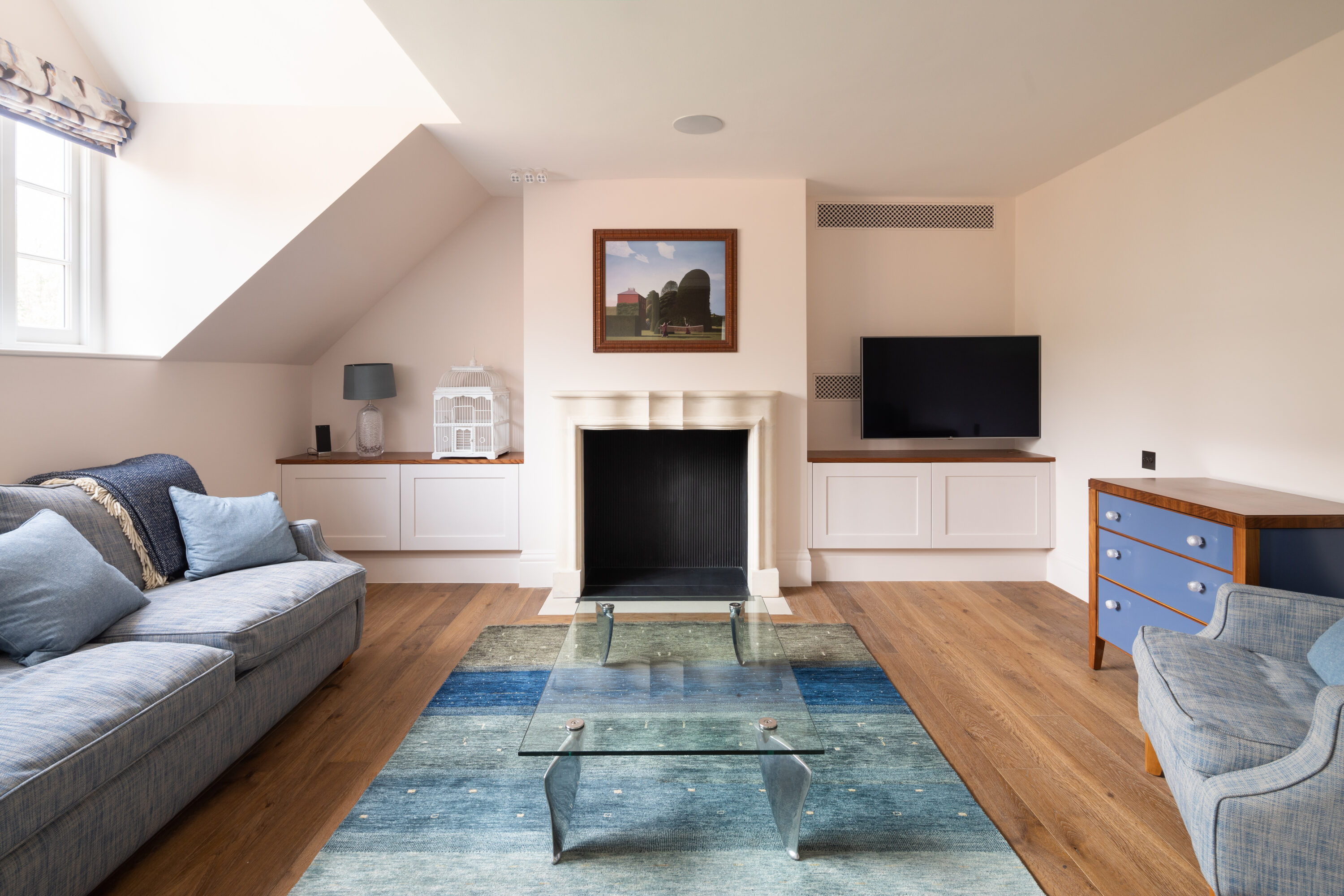 Within the living room, classical, square edged wall panelling creates a refined aesthetic and peaceful ambience, and accentuates the feature Brown Oak portal doorways that lead through to the children’s playroom. These accommodate in-built bookshelves, media storage and back-to-back pocket doors to ensure privacy and peace and quiet can be had when required!