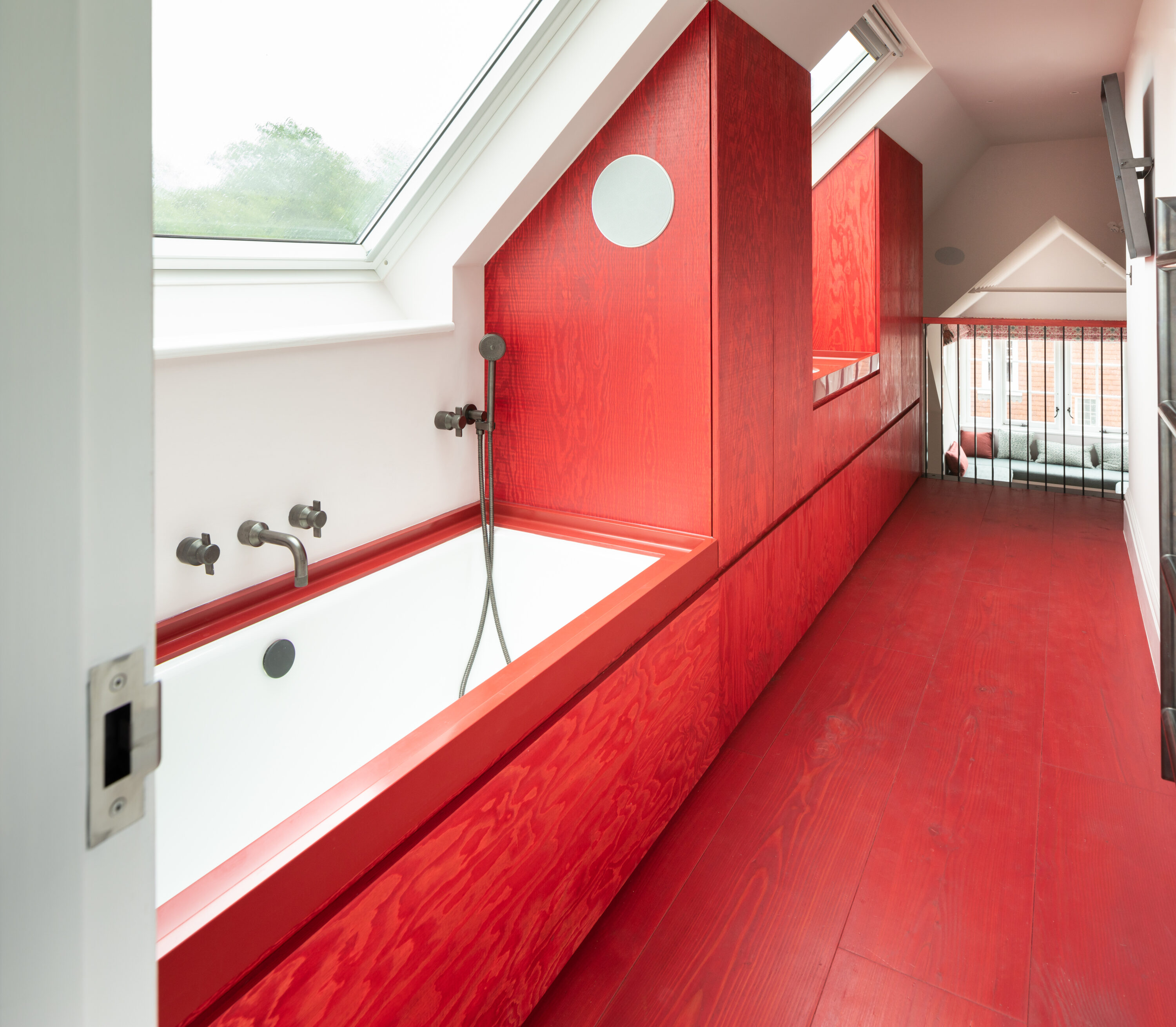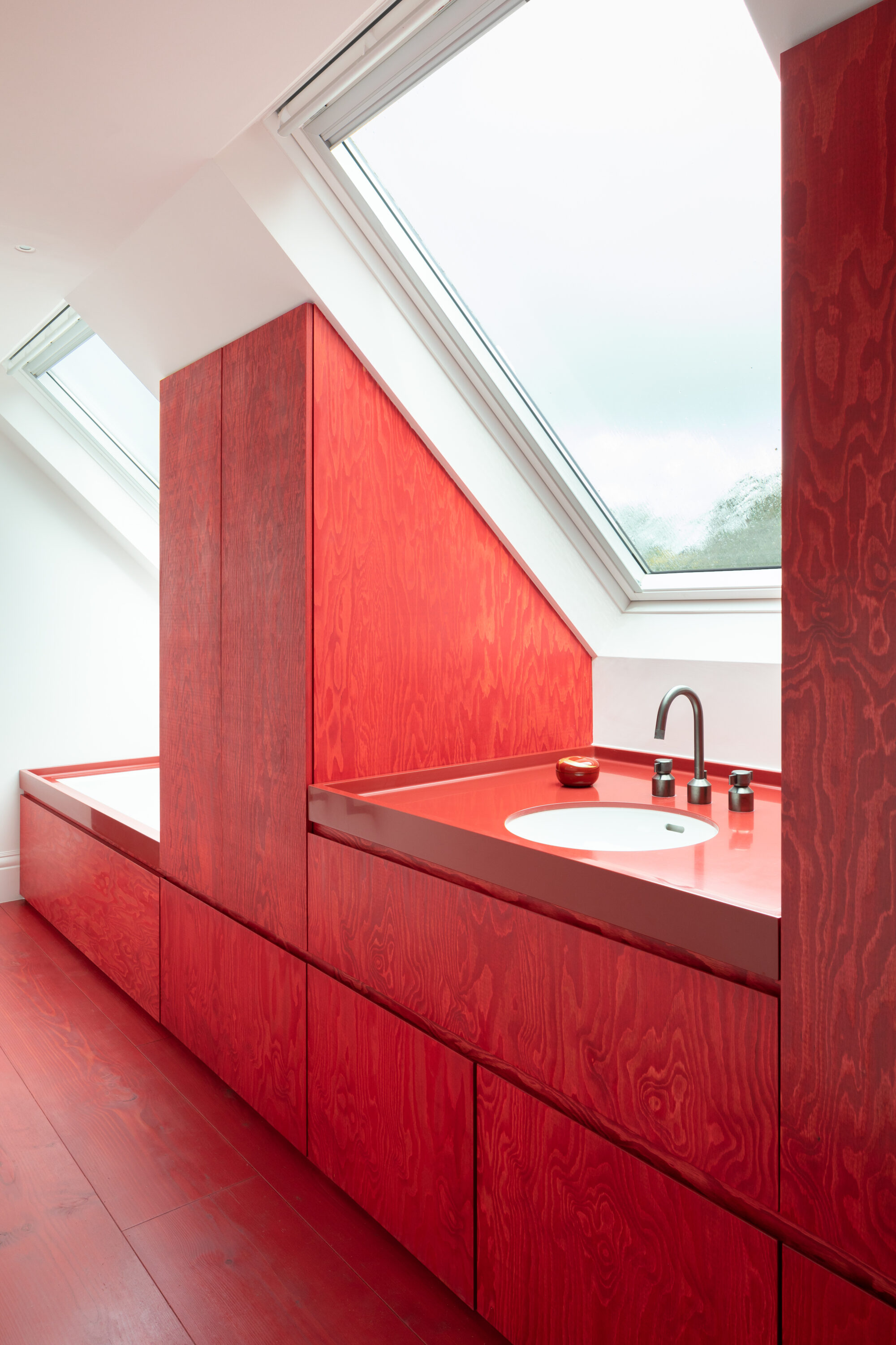 The integrated Red Corian bathtub and sink complete the block colour aesthetic.