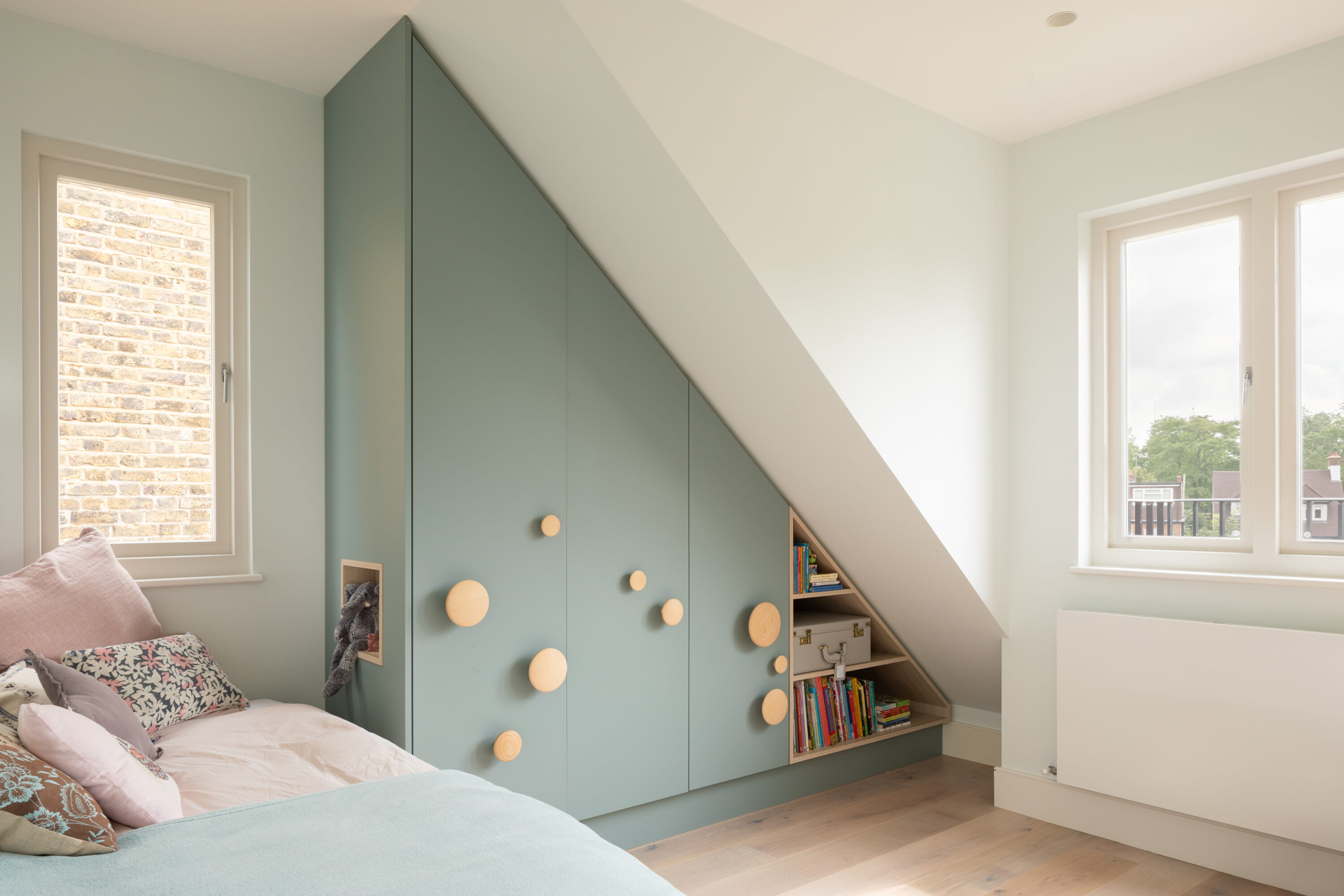 The stylish, yet playful cabinetry in the children’s bedrooms of the Courtyard house add an element of whimsy to the home. Here a robust and practical material palette was chosen, utilising dusky blue Perfect Touch doors and panelling which are accented by Navarra Ash exposed shelving.