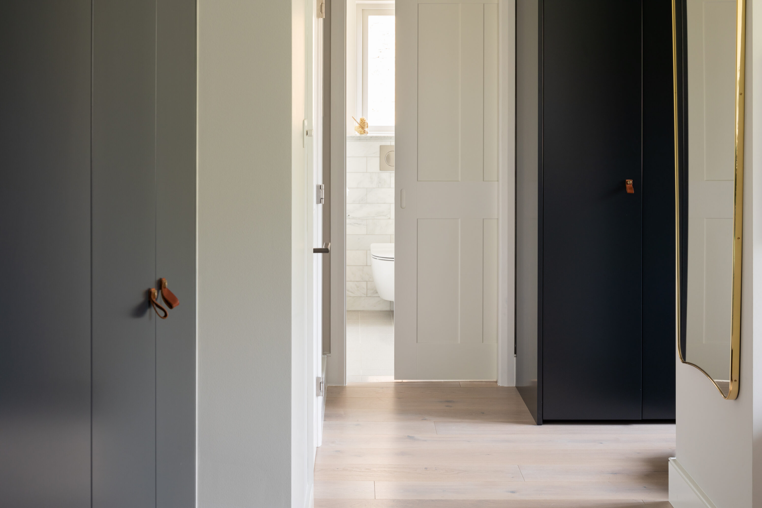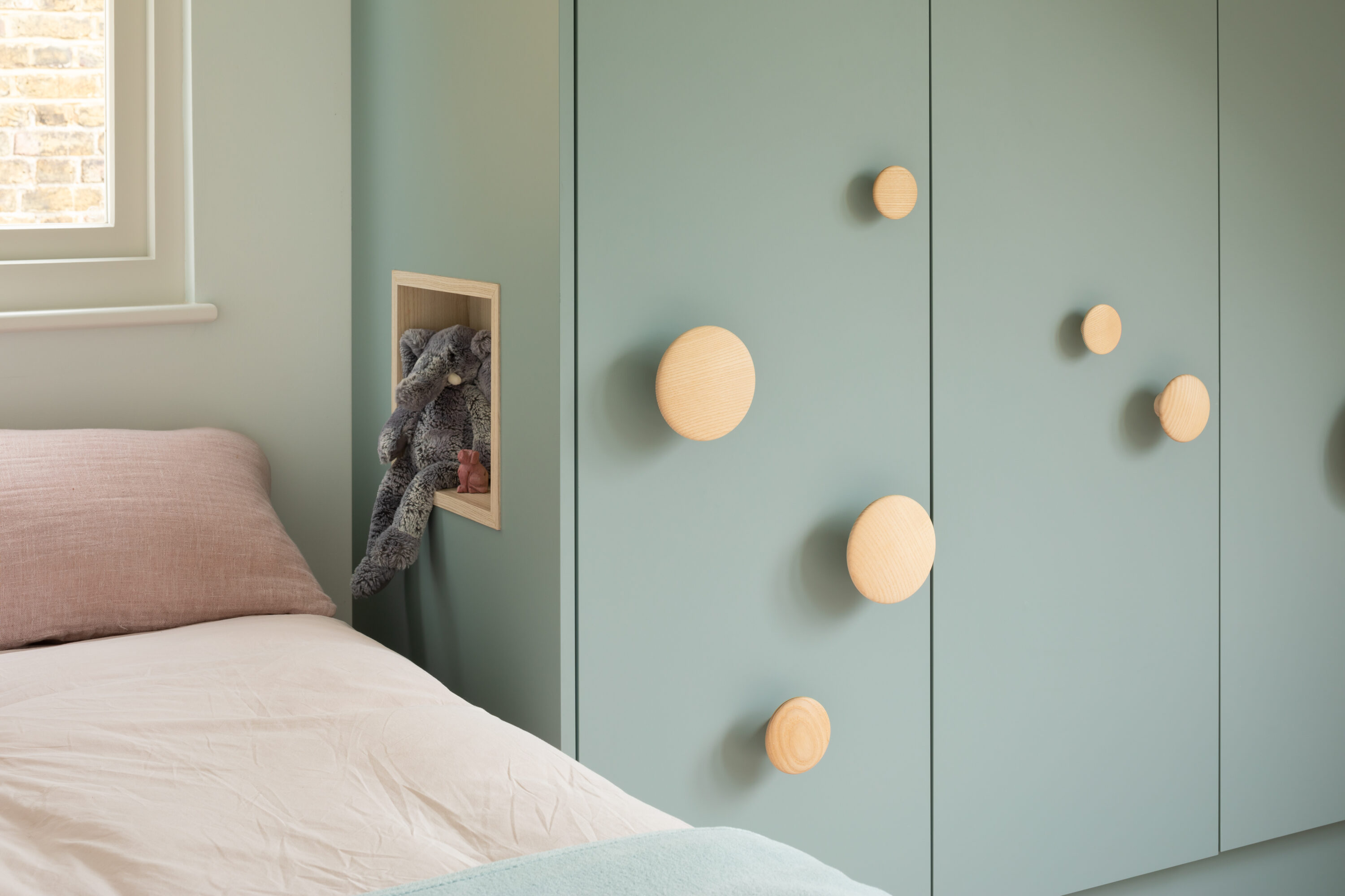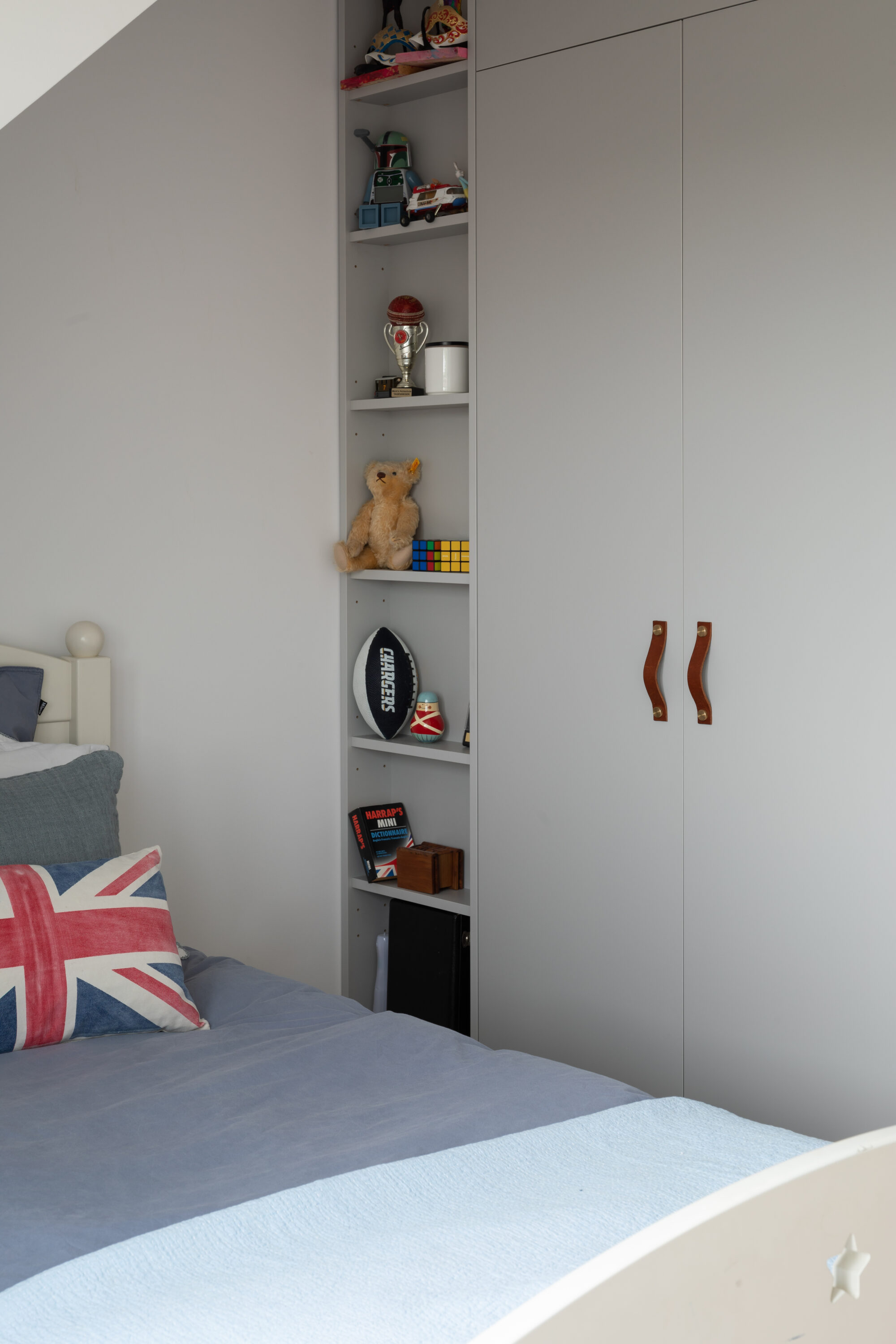 We incorporated Muuto Dots in a variety of sizes, that double as both handles and coat hooks. In the adjoining bedroom, Dowsing and Reynolds ‘Thor’ leather handles with a raw brass finish are combined with soft grey cabinetry to create a more ‘grown-up’ space with plenty of storage and sufficient shelving to show off the finest toys and trophies!