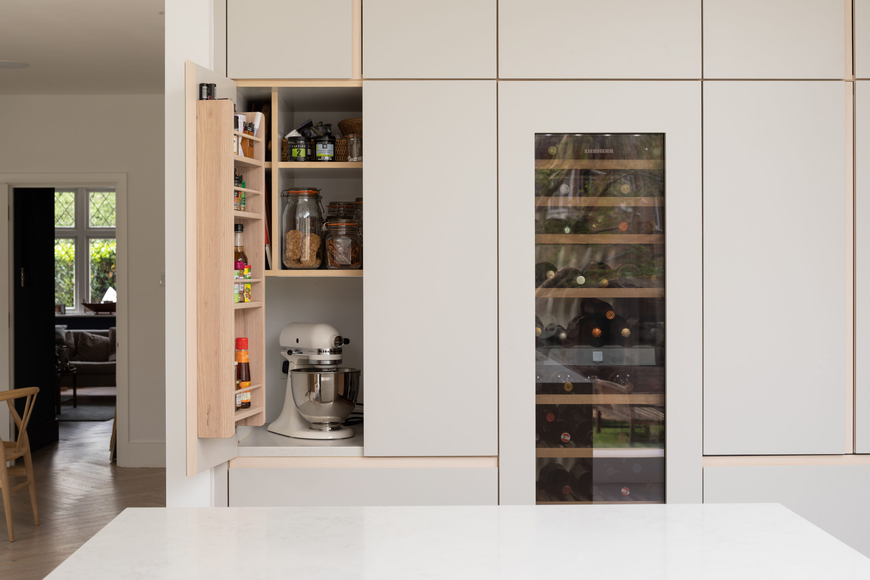 On the reverse of the island, the Carrara Quartz worktop coordinates beautifully with the white-washed Ash doors and floating shelves. Ash was also used internally, the door hung spice racks offer a decorative storage solution, and the built in Wine Fridge has a recessed Ash handle detail.