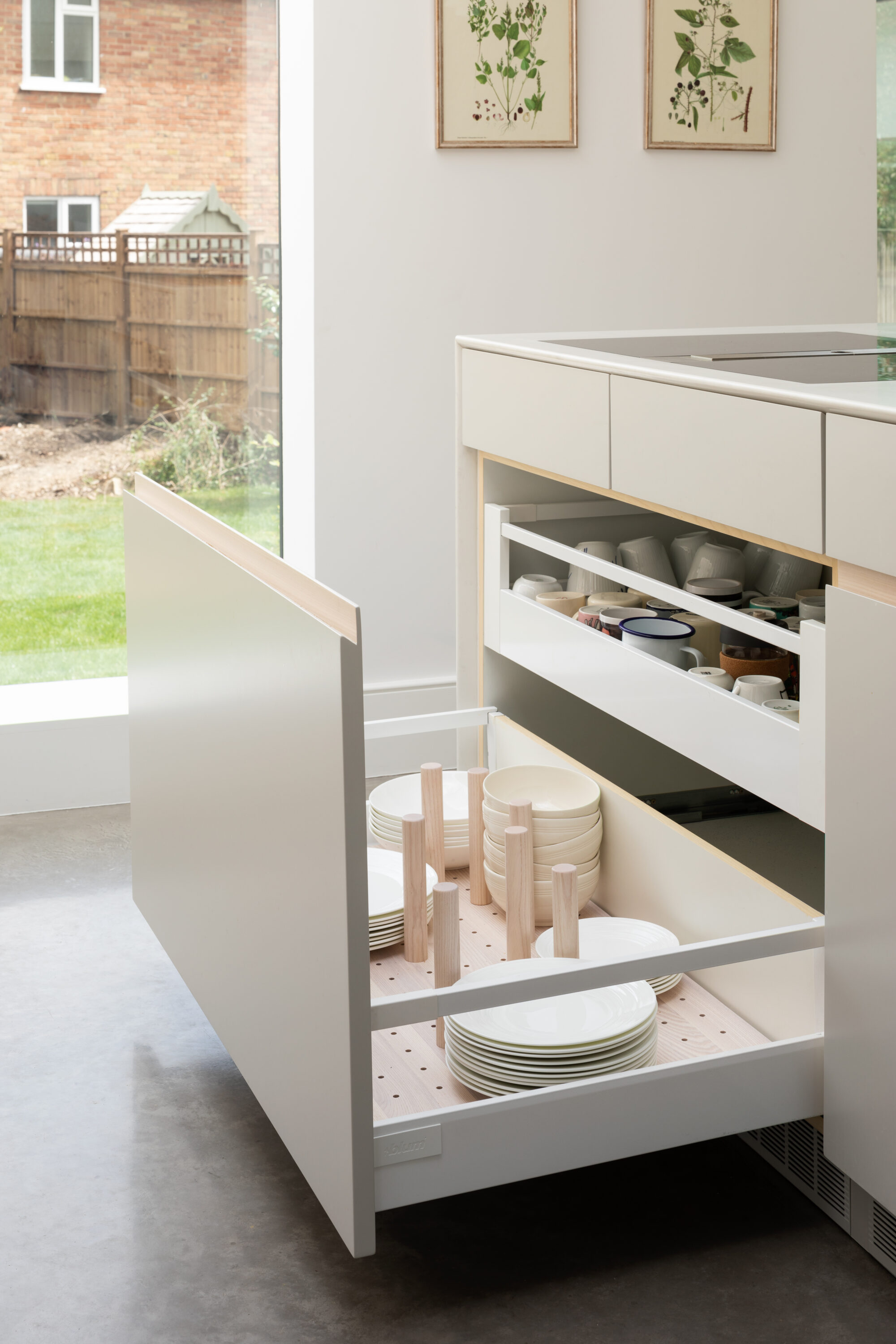 Within the kitchen, Cornforth White sprayed doors and panels are complimented with white-washed Ash detailing, creating a refined and timeless aesthetic. A shark-nosed Carrara Quartz worktop adds a crisp, slim profiled edge, framing the cabinetry. This is achieved through the chamfered edges of the doors and drawers, elevating the look and feel of the kitchen.