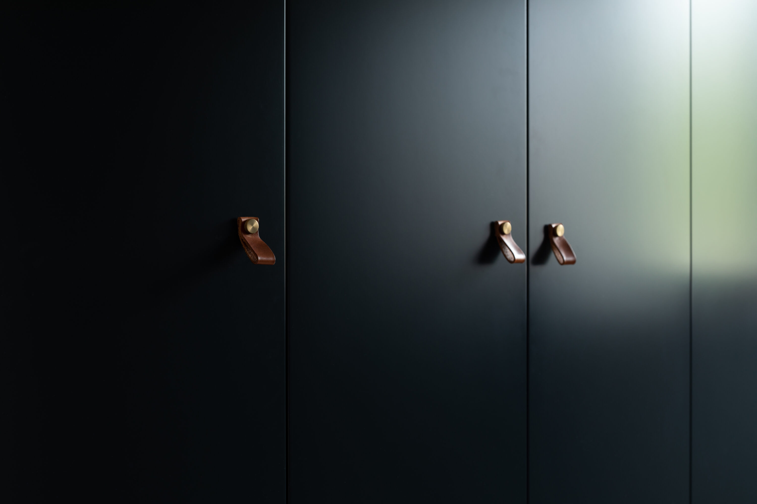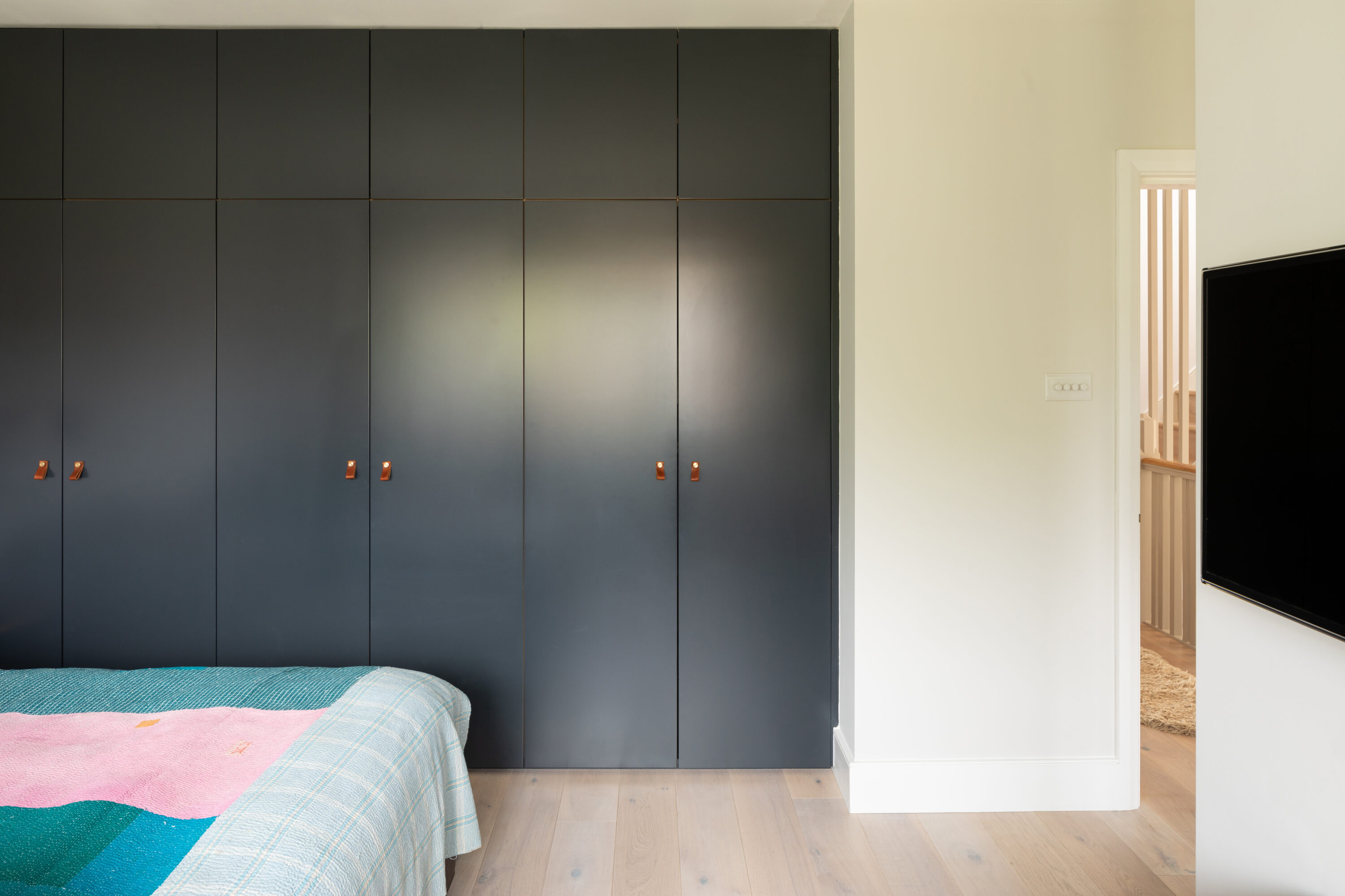 Within the master bedroom, the contemporary wardrobes make a statement, elevating the look and feel of the space. The dark navy spraywork is elegantly complemented by raw Brass and Chestnut leather handles, whilst the Stone Oak cabinet internals and drawers offer a tasteful contrast.