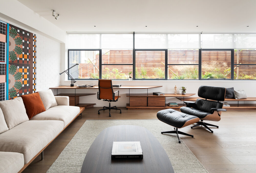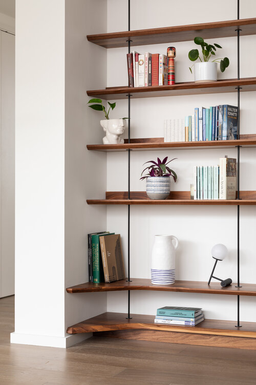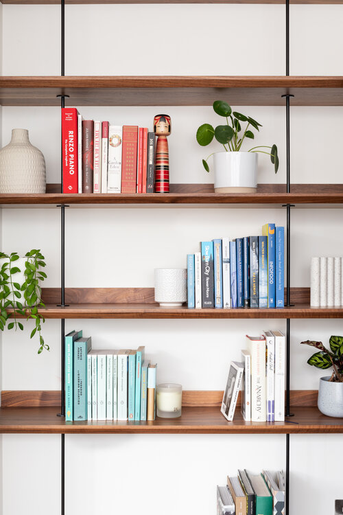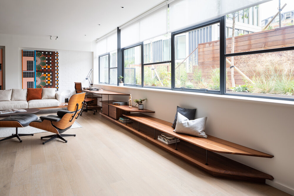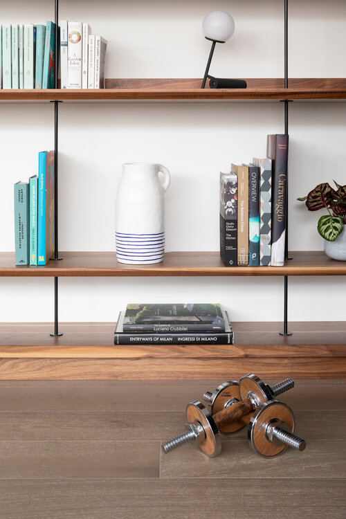 Concealed wall fixings were used throughout, creating a floating effect, and we finished the piece with custom powder coated steel supports, fabricated by Design + Weld, which allows the unit to multitask as additional bench seating when entertaining guests.