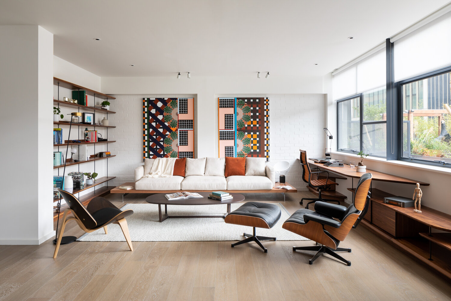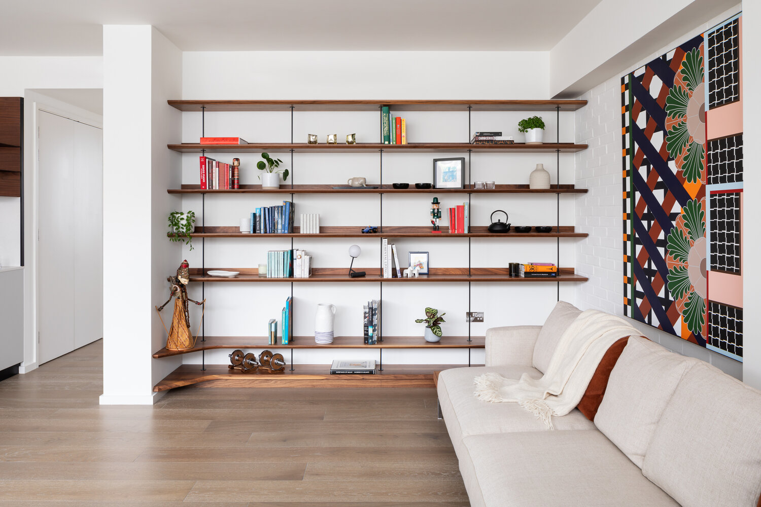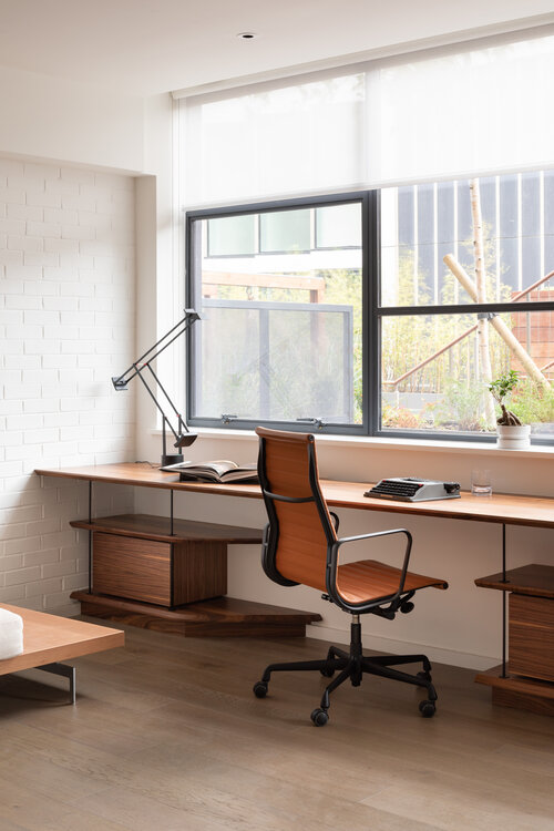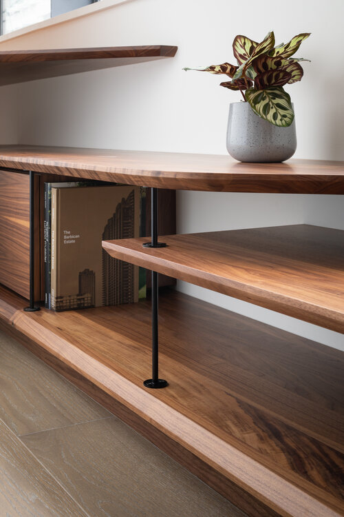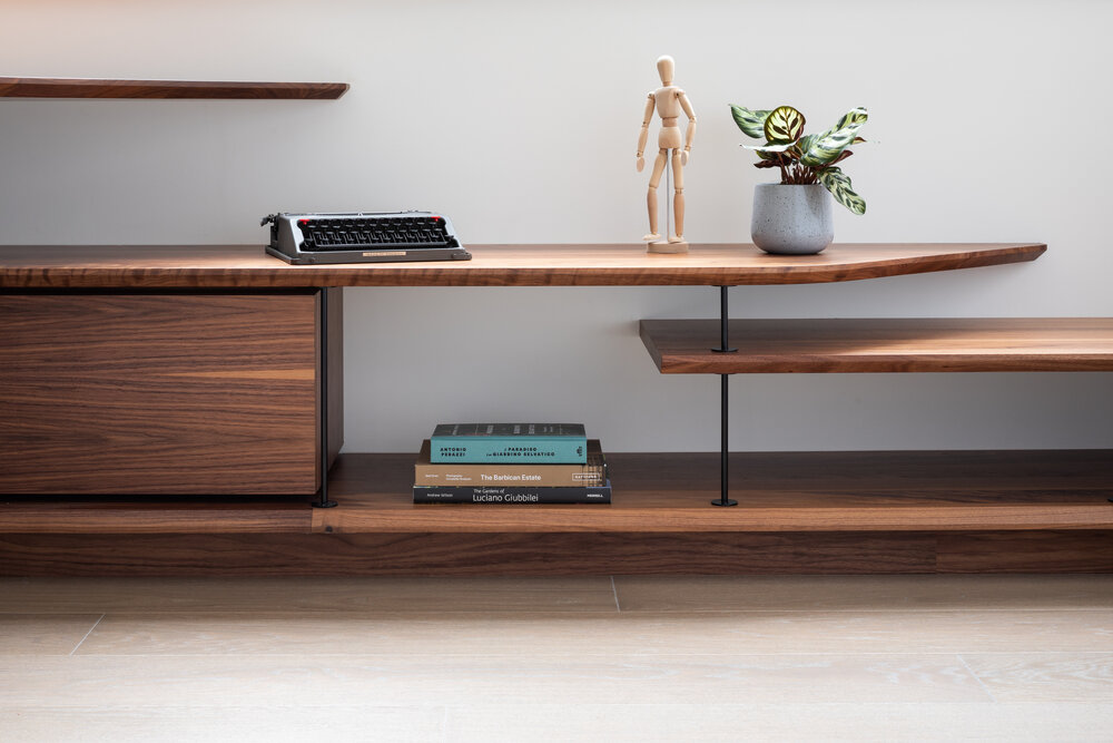 The unique form of the desk and storage add flow to the room, via the curvature of the solid American Black Walnut worktops & shelves.