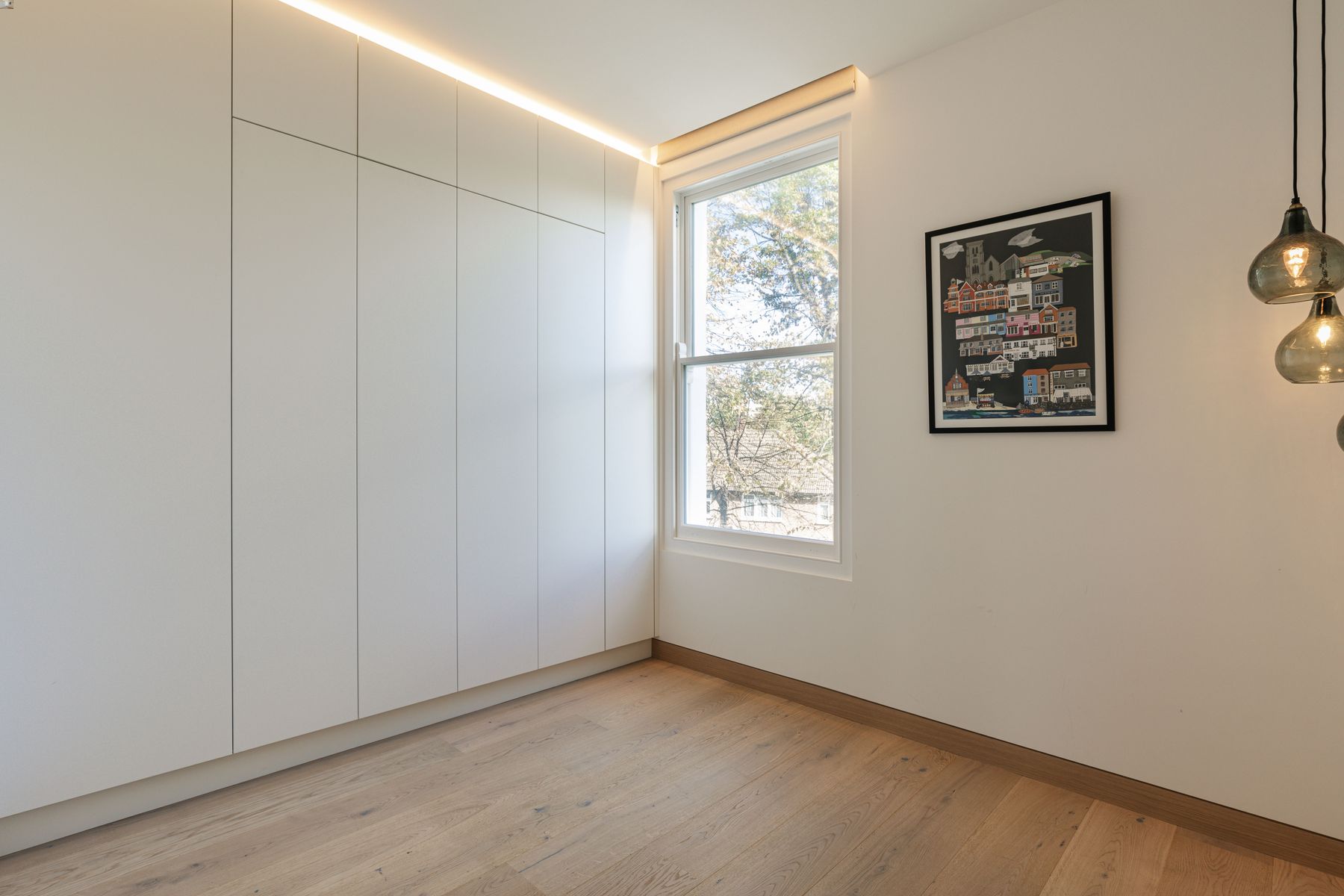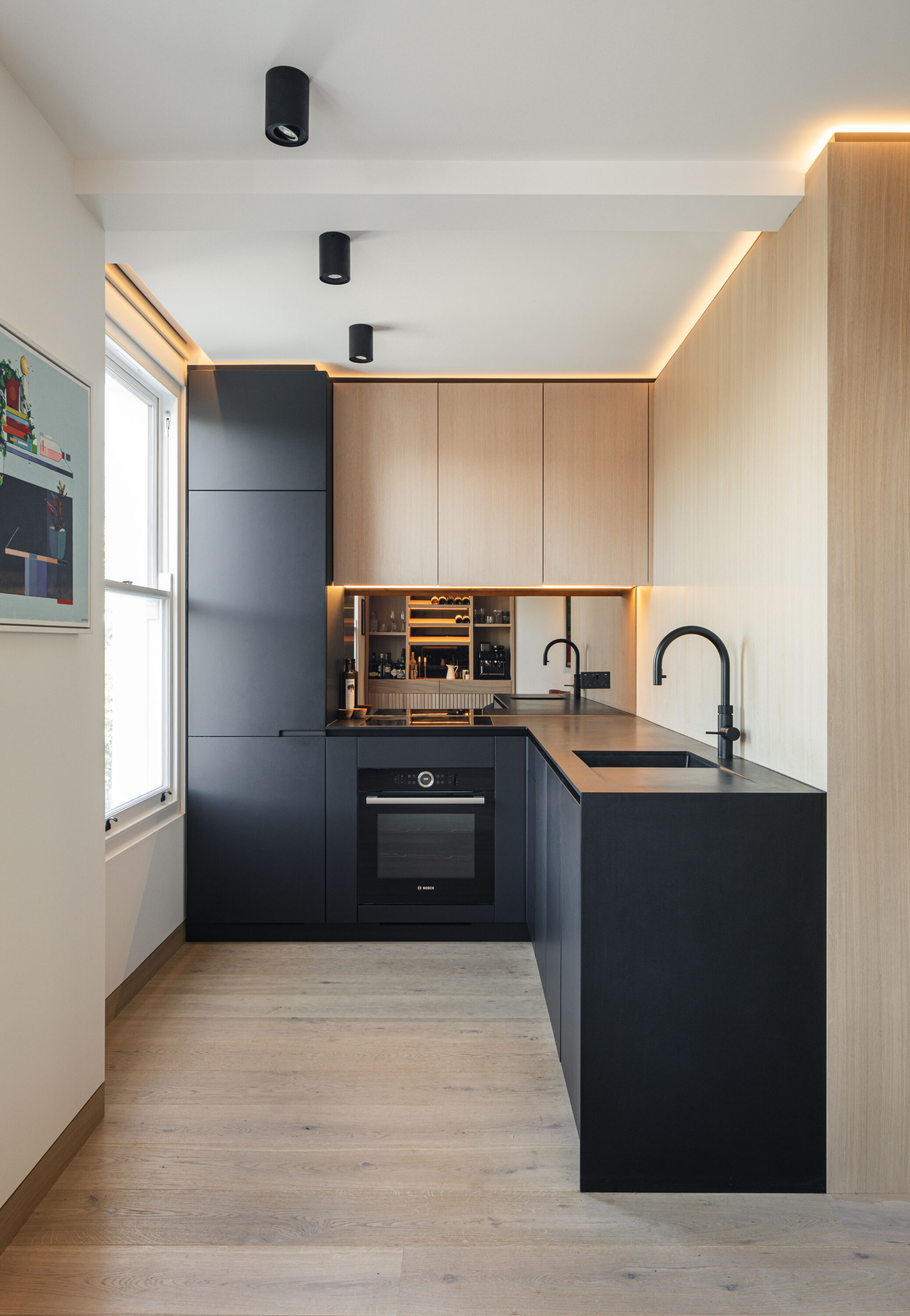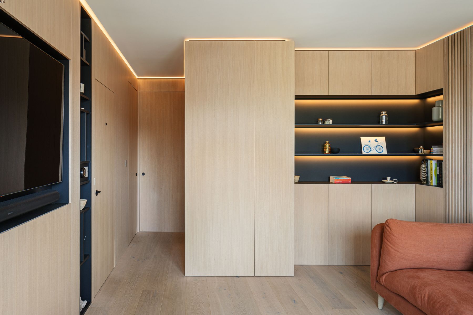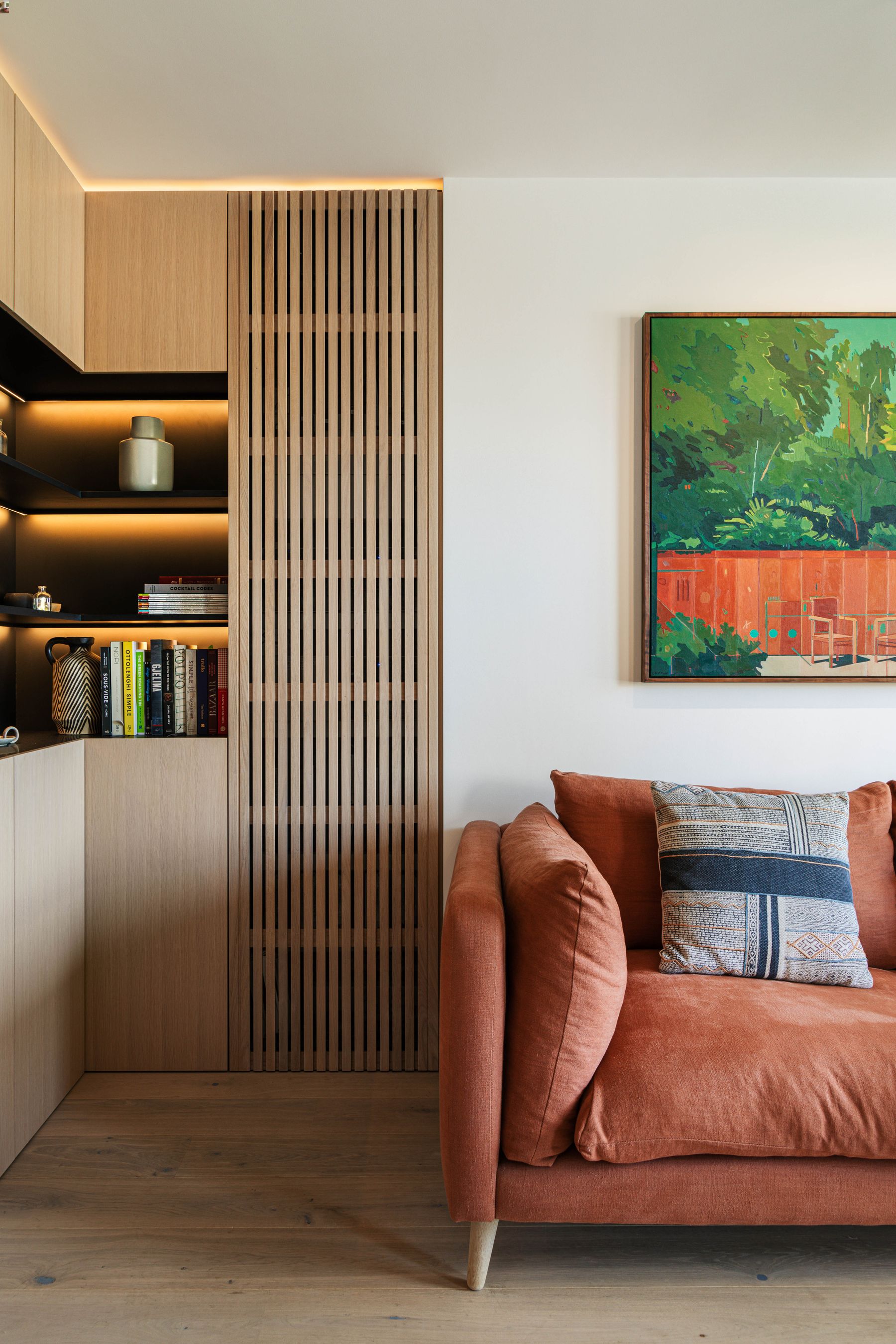 Half the flat is panelled in quarter cut European Oak veneer, concealing the entrance door as well as to the bathroom and both bedrooms.