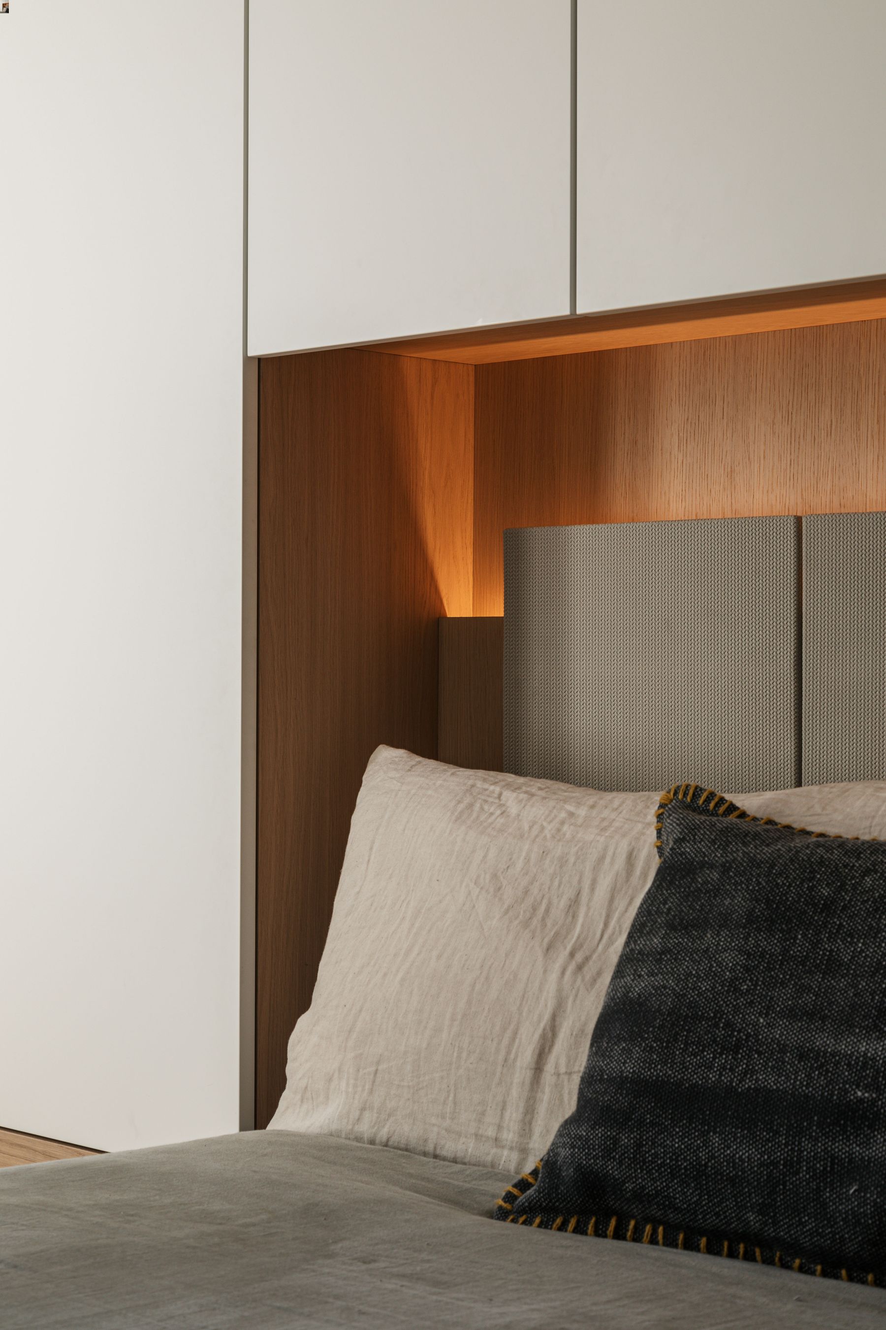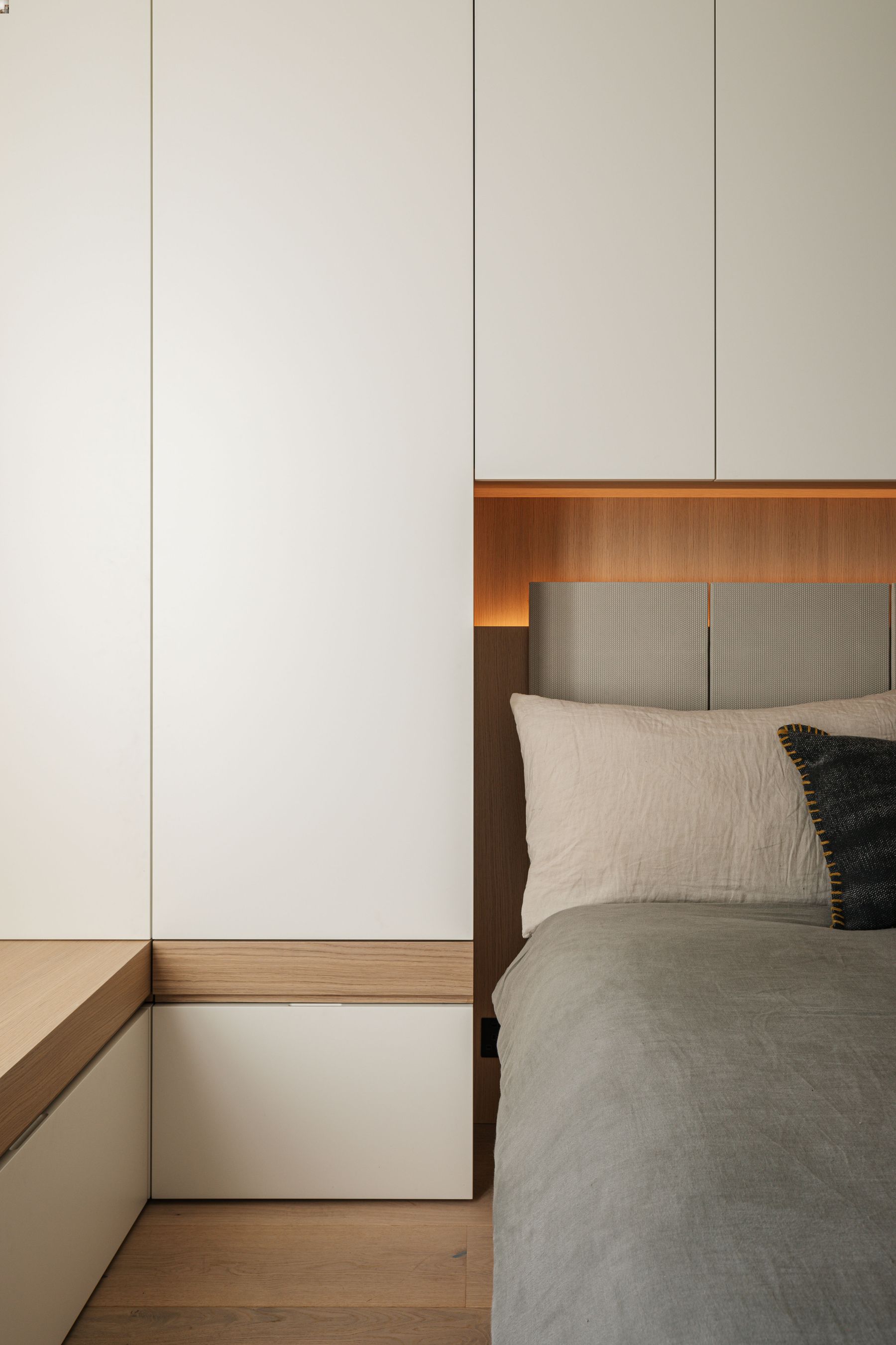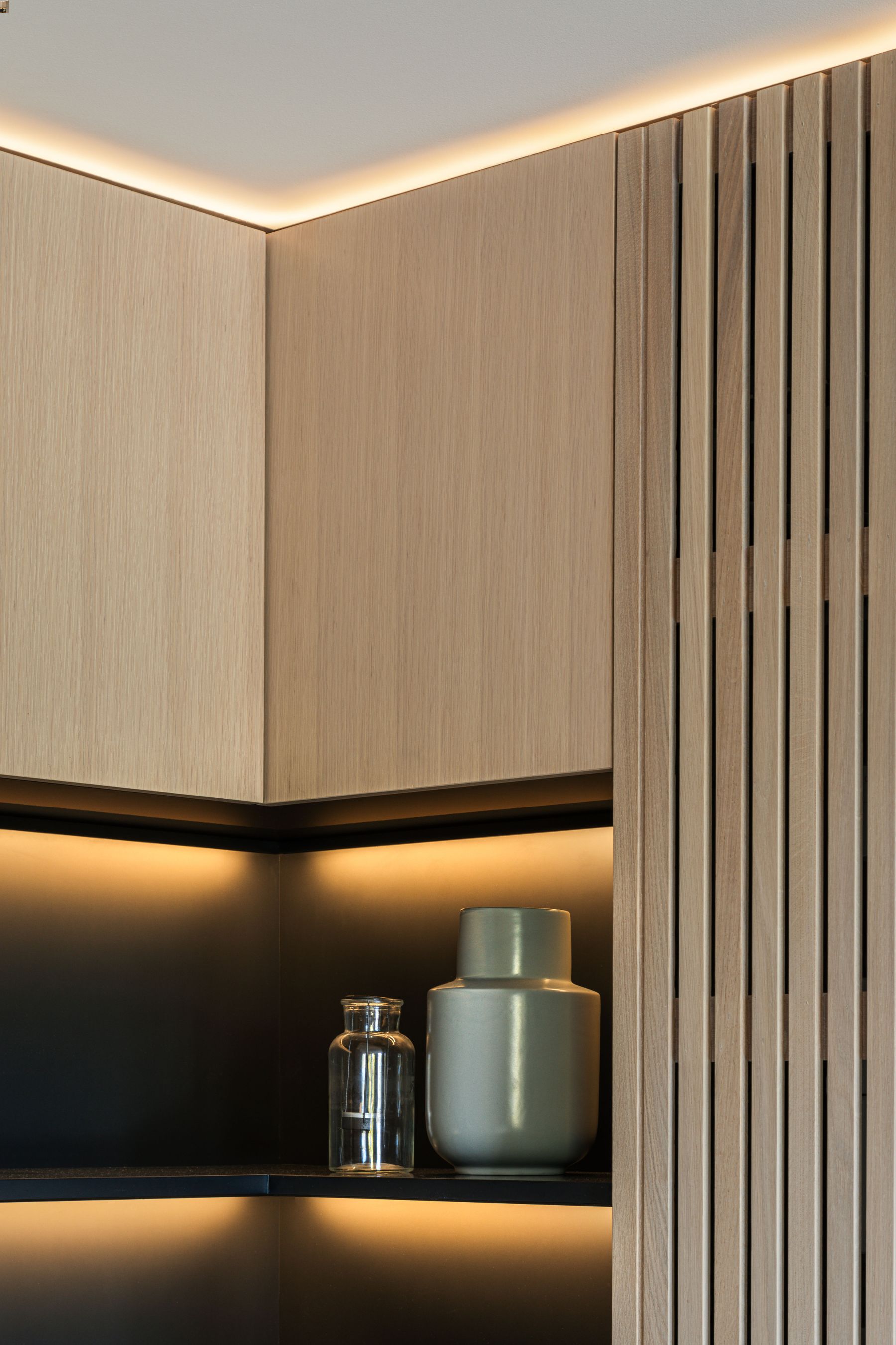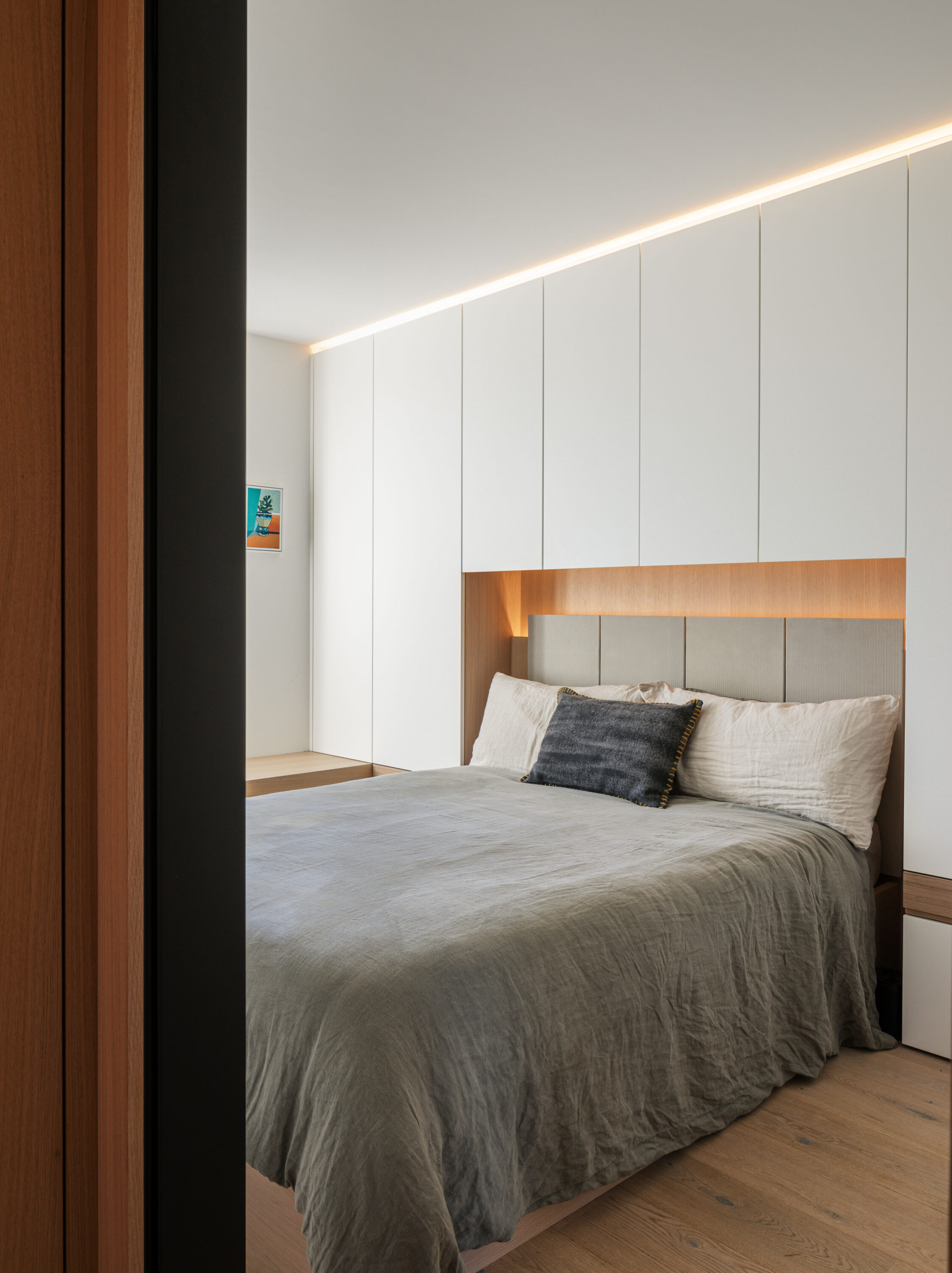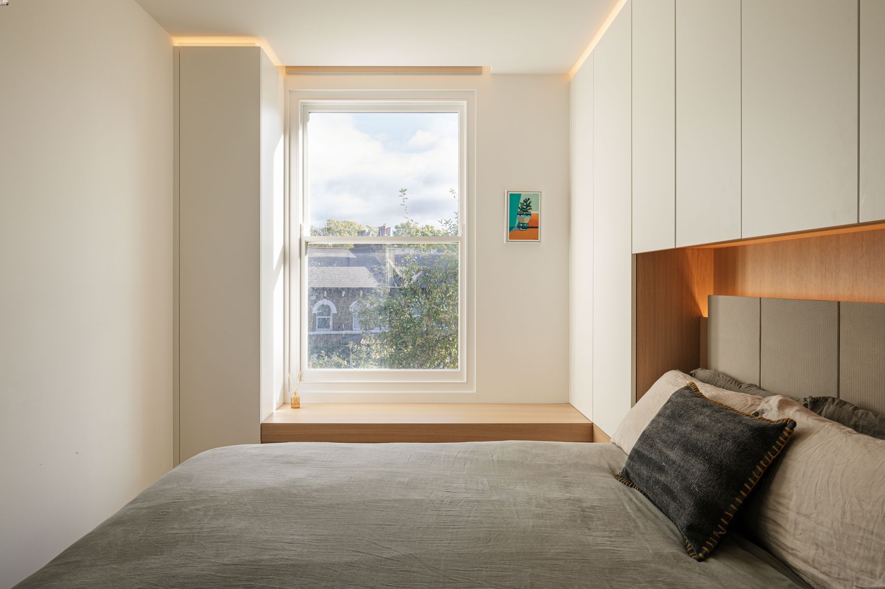 Half the flat is panelled in quarter cut European Oak veneer, concealing the entrance door as well as to the bathroom and both bedrooms.