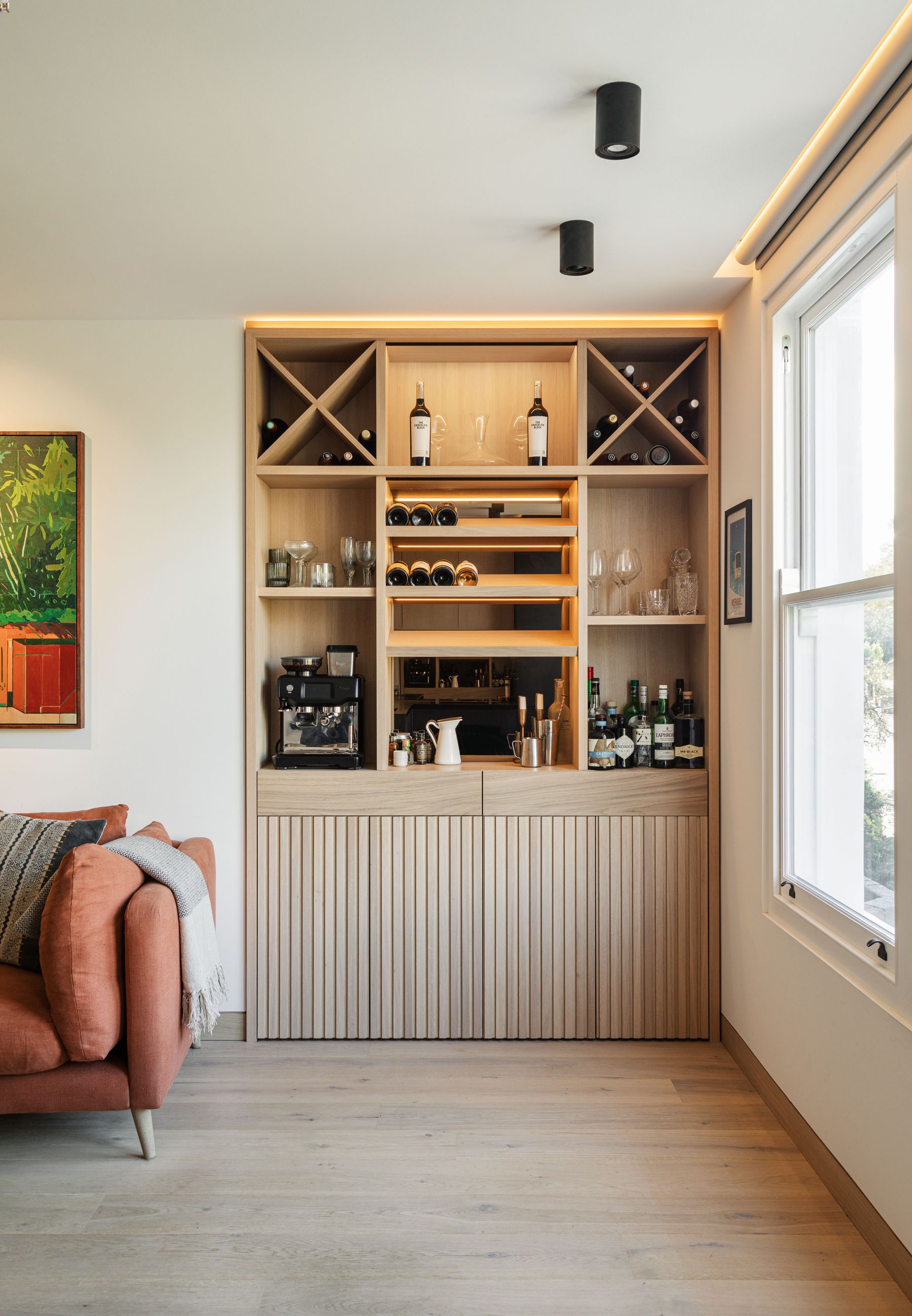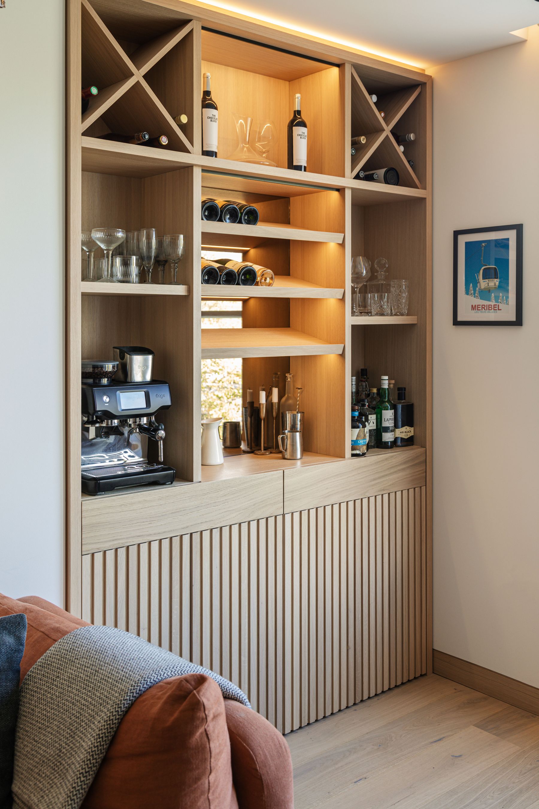 The feature bar and coffee cabinet offers a focal point to the dining area and affords ambient and atmospheric lighting thanks to the recessed LED lighting.