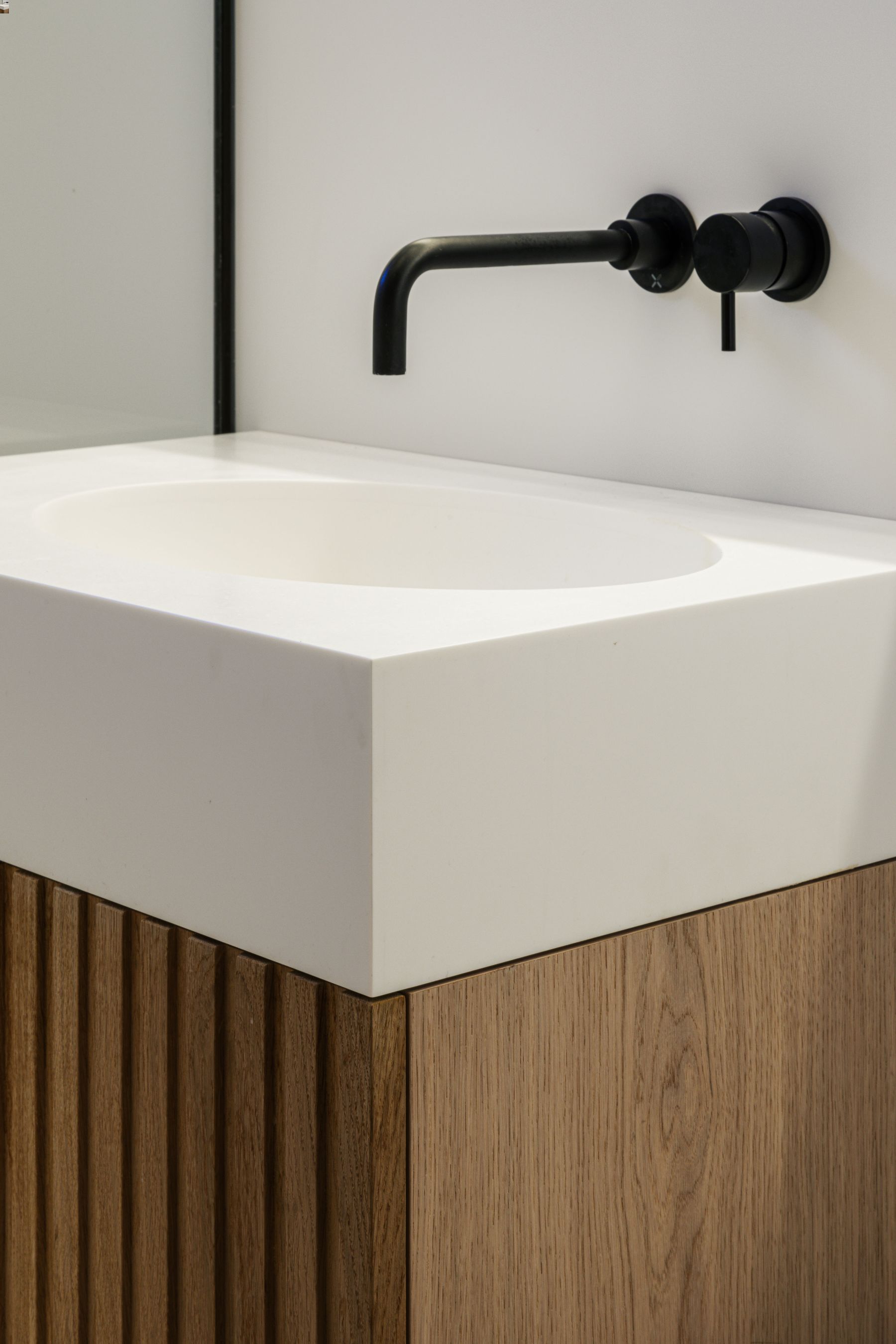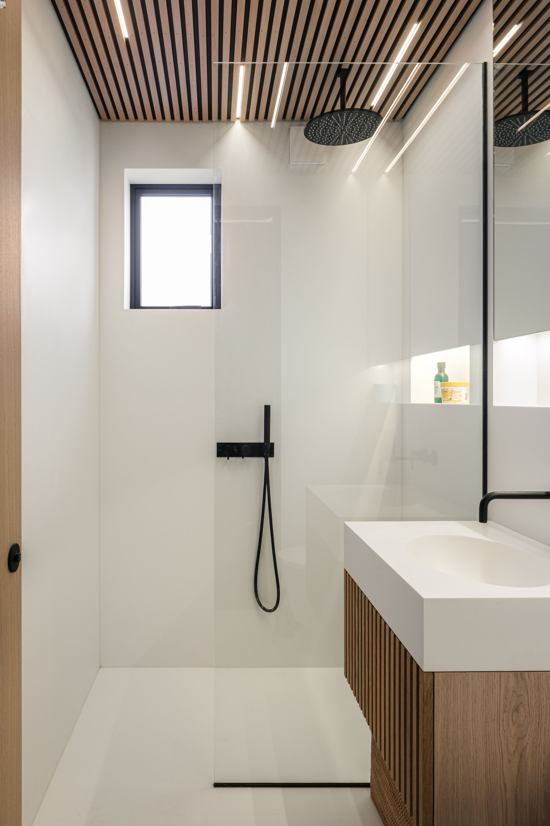 The bathroom is completely Glacier White Corian, with a slatted Oak ceiling that features integrated LED lighting.