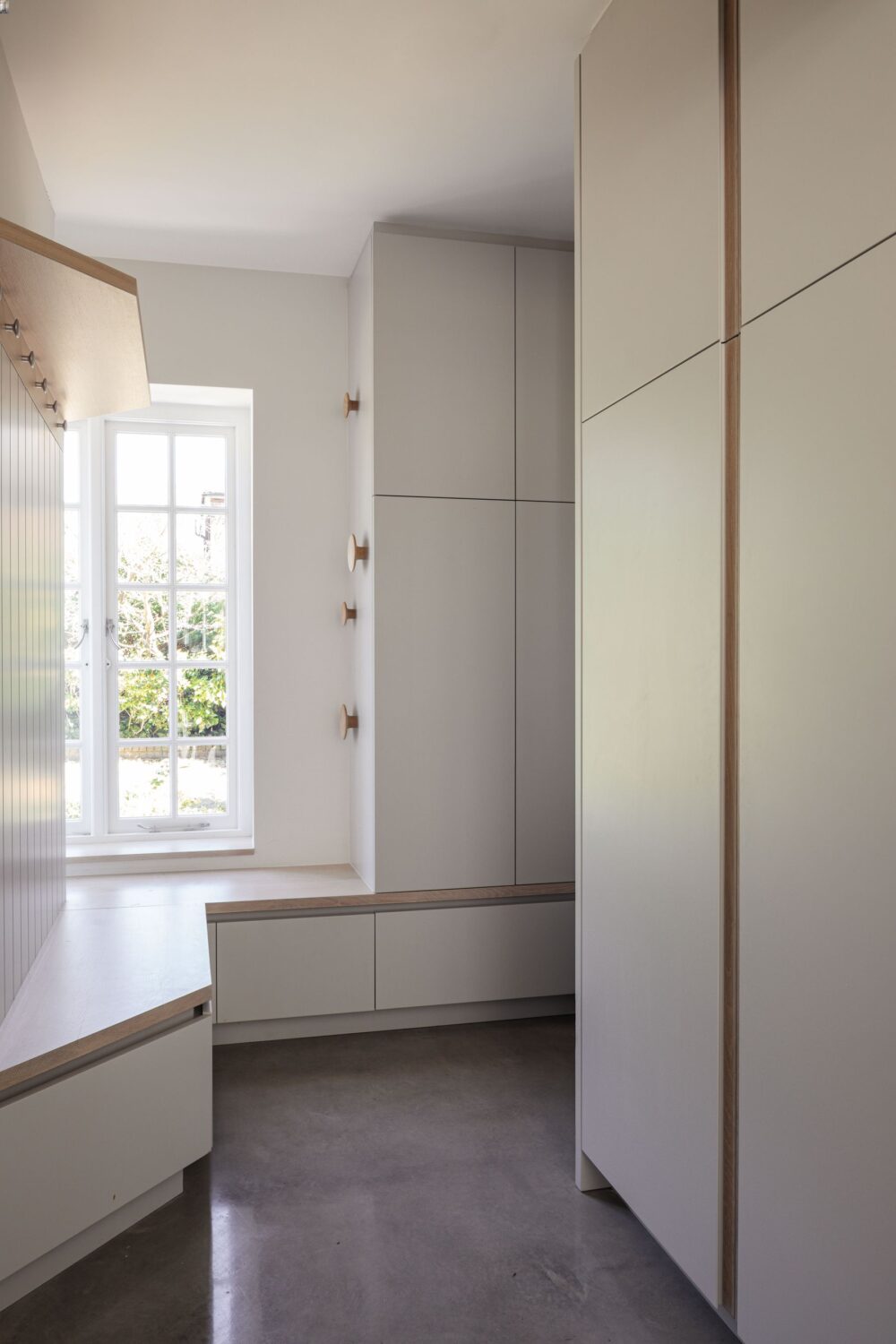 The custom bench wraps around the corner offering suitable space to remove the muddiest of wellies.