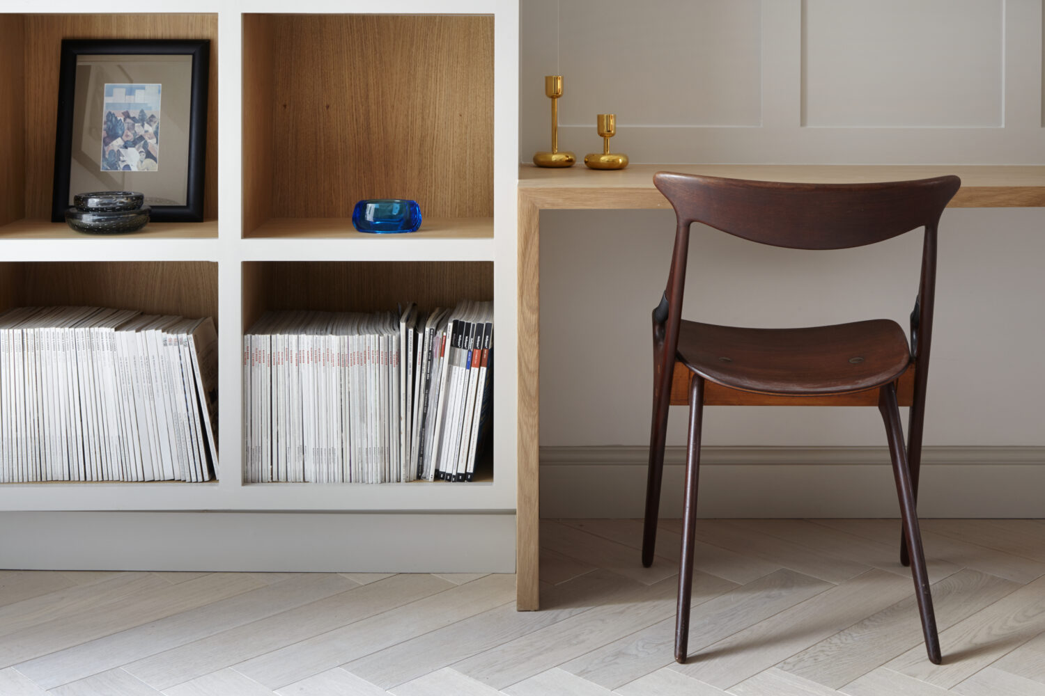 In the living/study area, Shape created multiple pieces of bespoke fitted joinery including the iconic angled writing desk and pigeon hole shelving, maximising storage and allowing the client to display their beautifully eclectic collection of artefacts and books.