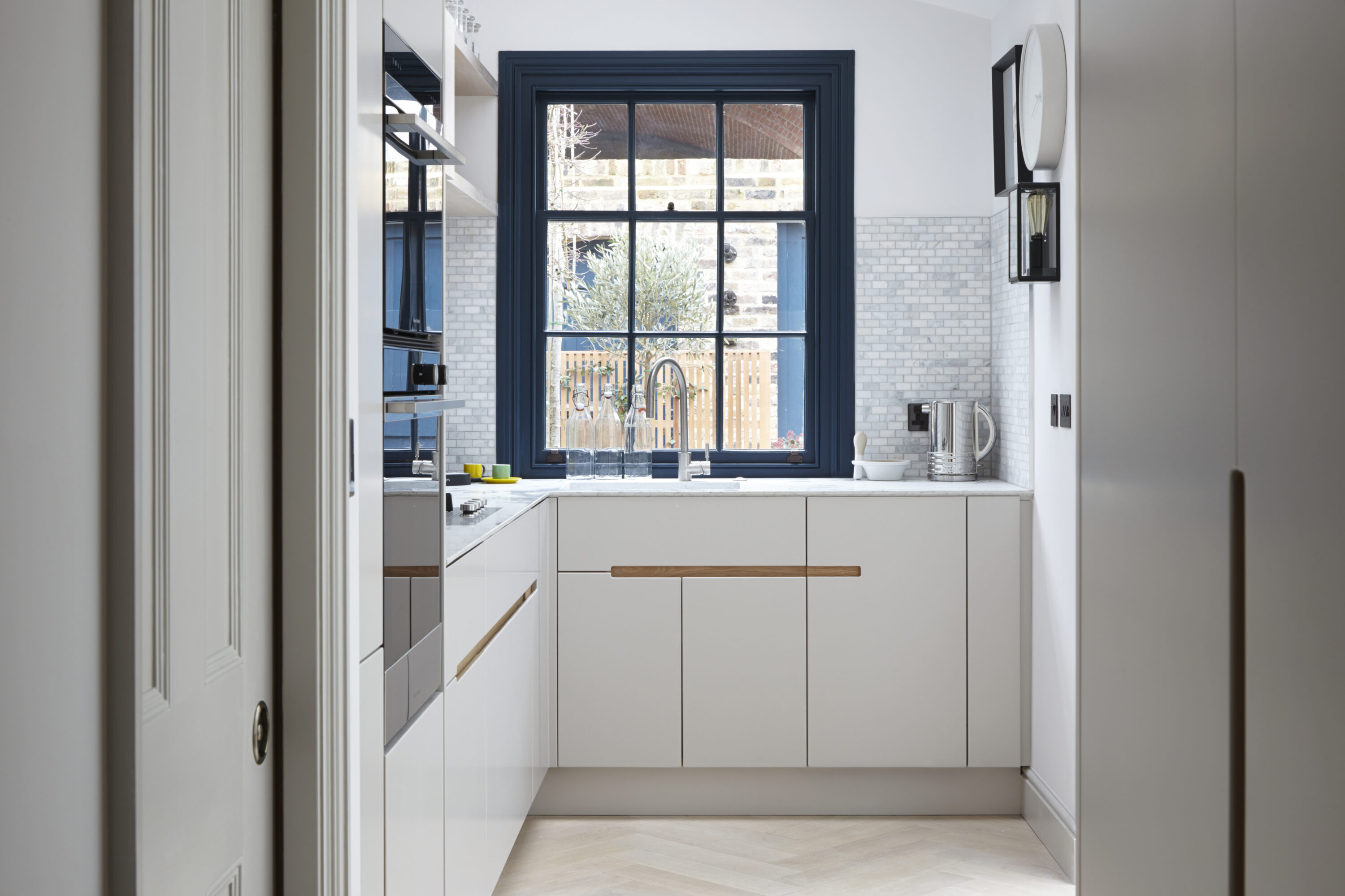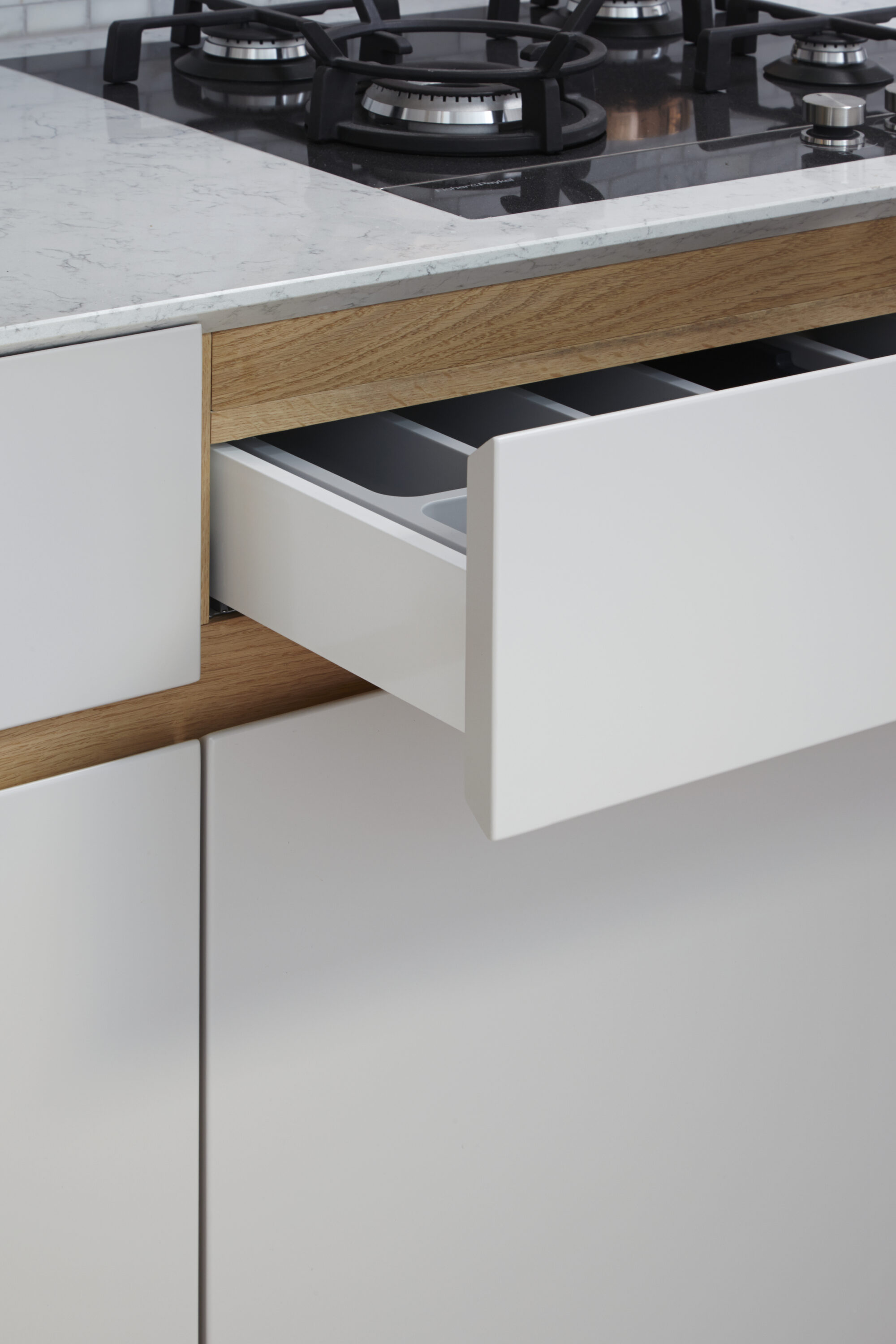 The stand-out features in the kitchen are the recessed Oak handle details and shark-nose Carrara Quartz worktop with mitred doors and drawer fronts, creating a slim, 10mm, contemporary edge detail.