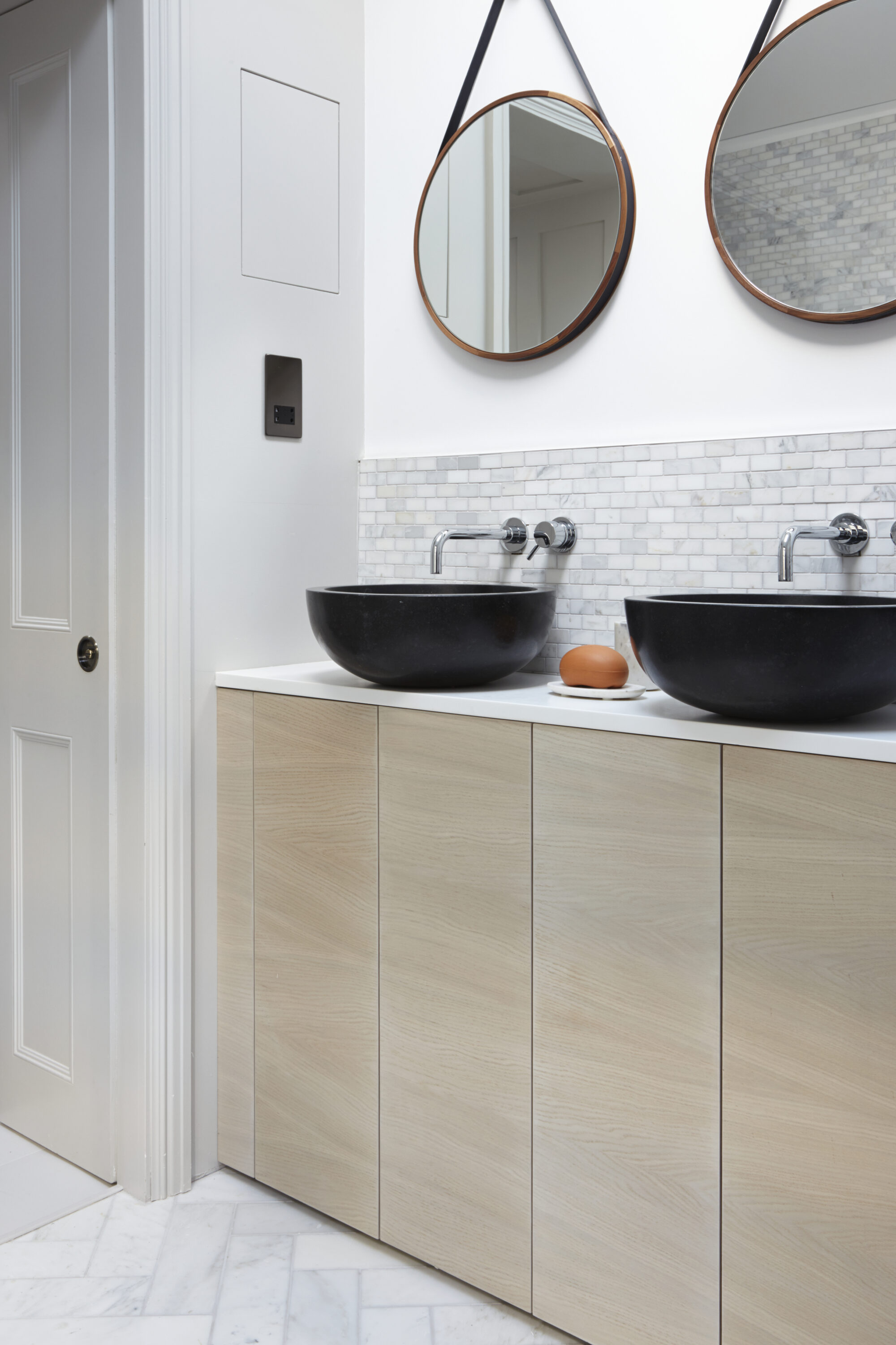 We retained a neutral material palette throughout the property’s bathroom, and allowed the quality of the materials and high standard of finishes to take center stage; using white-washed Oak in the bathroom, and sprayed panels in the utility.