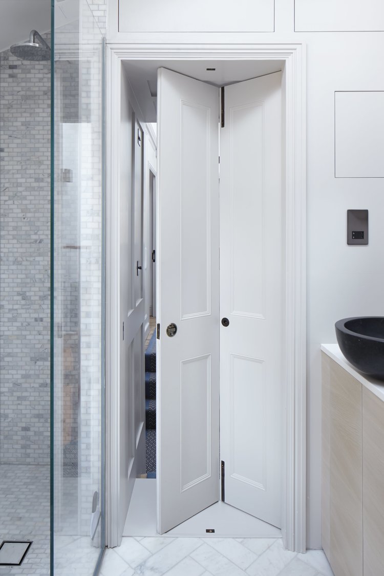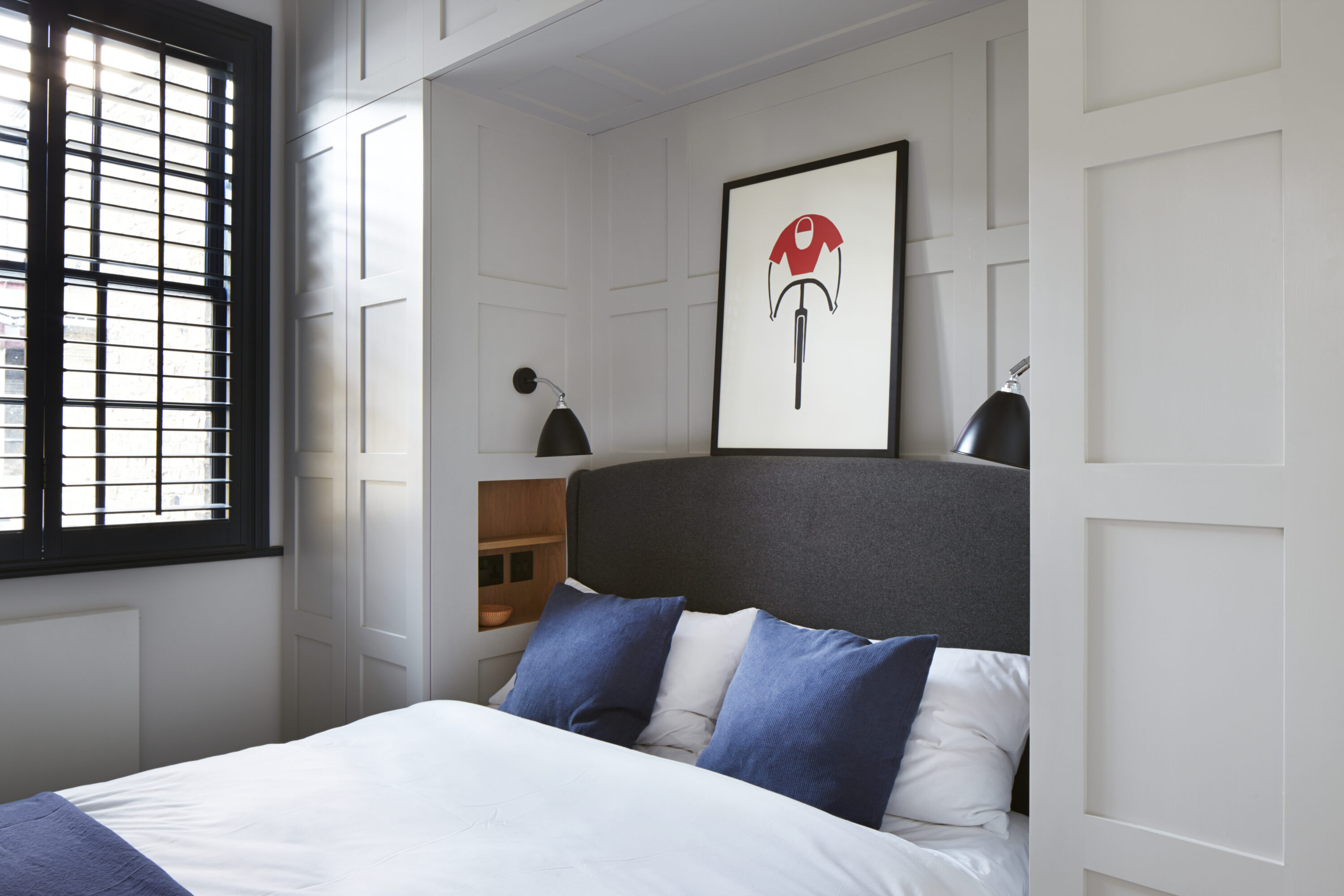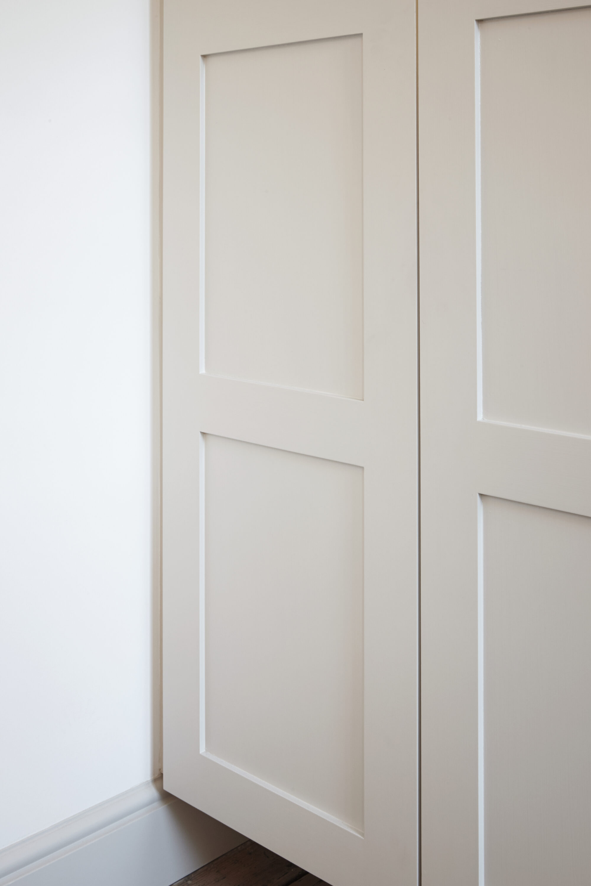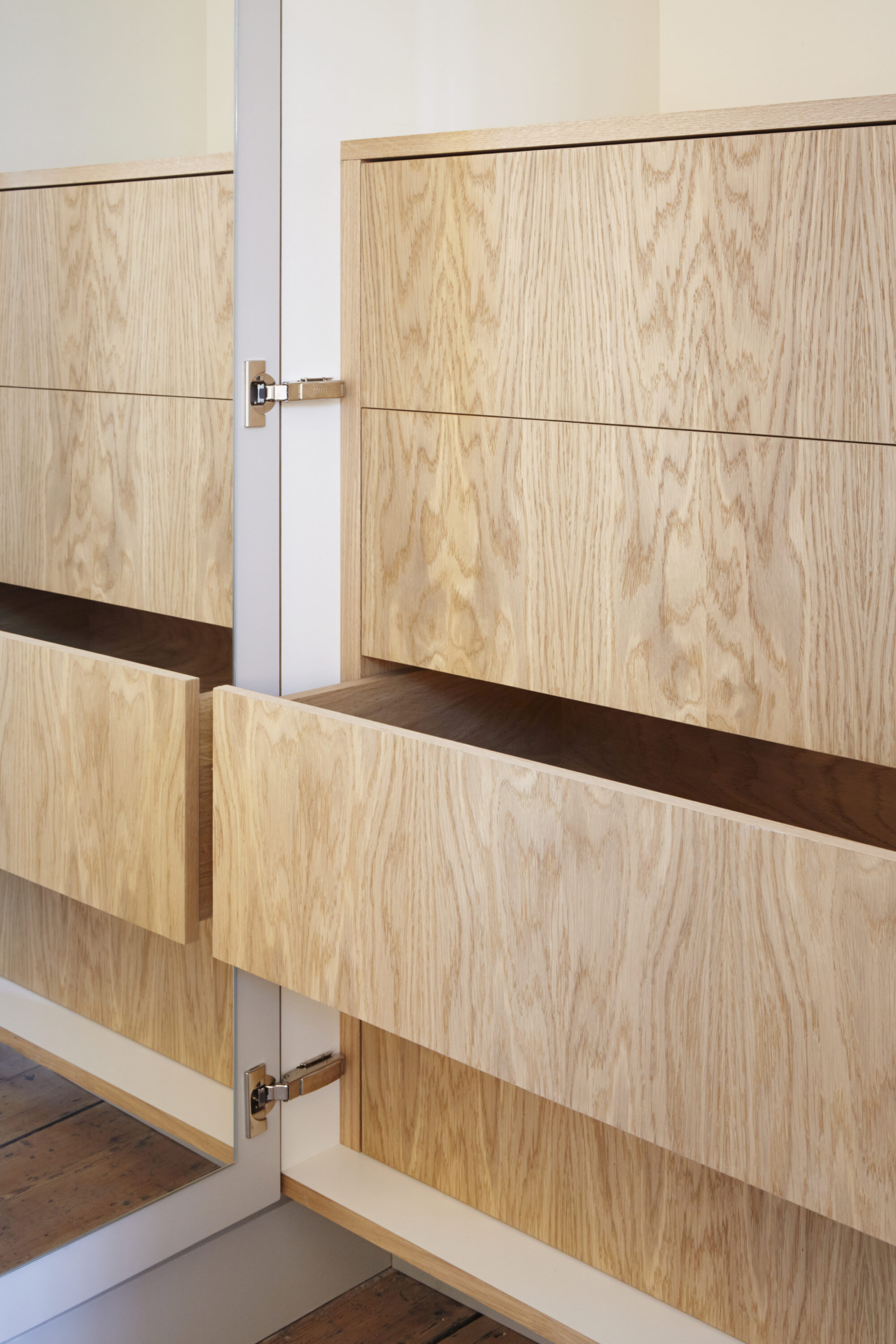 The bedroom furniture was designed to be disguised as panelled walls. Each cabinet was defined by the panel modulation and thus blends seamlessly from wall to cabinet. The Oak internals offer a good contrast with the light sprayed doors.