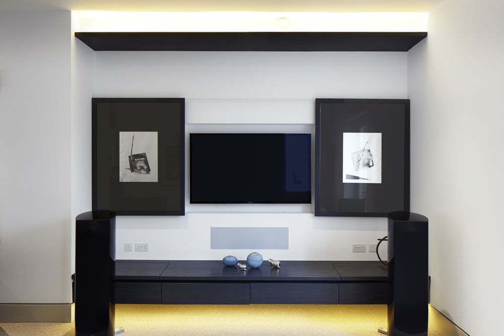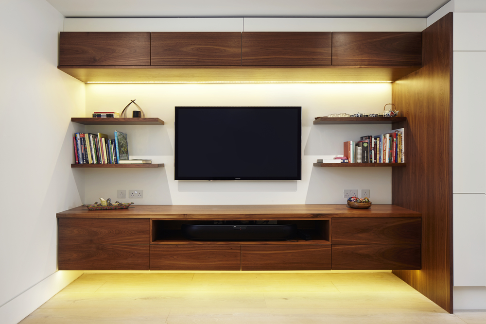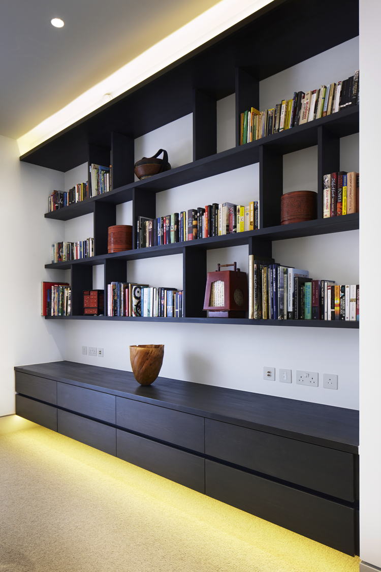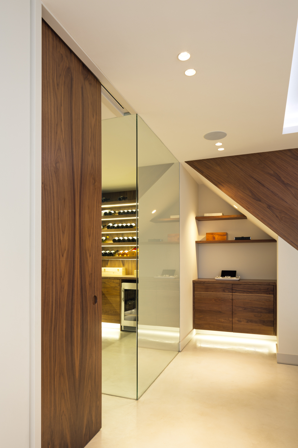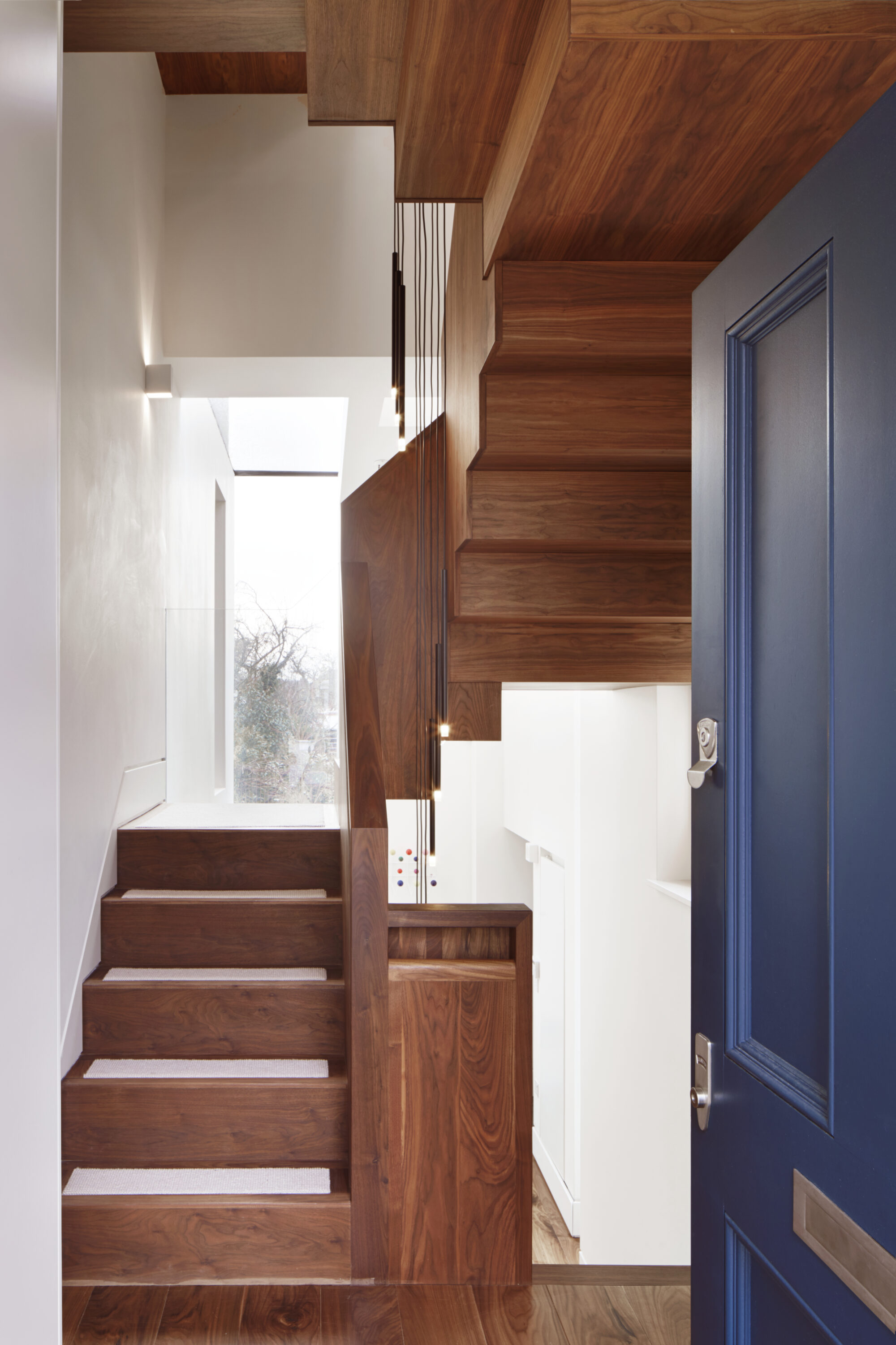 We used American Black Walnut to transform the corner of the property into a piece of art. The custom built feature staircase is accented by back-lit recessed handles, inset carpet treads, and bespoke lighting.