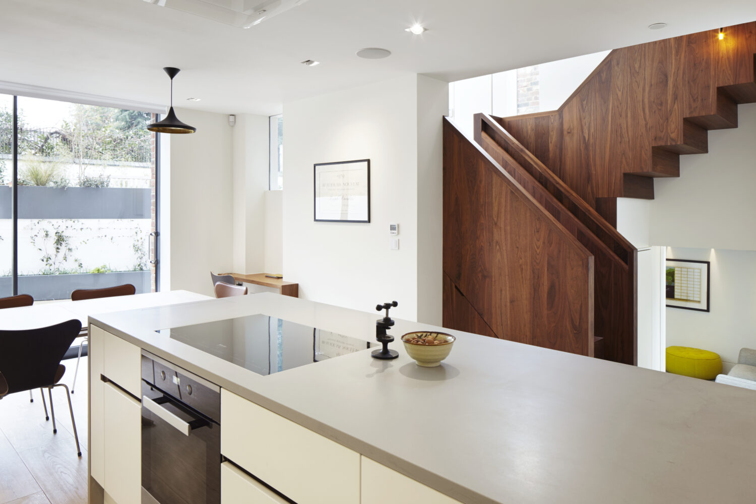 A defining feature of the Lantern is the American Black Walnut staircase that extends the full height of the property. The custom lighting and the large apertures within the external facade, give this project its name, ‘The Lantern’. All materials were chosen to create a sense of luxury, whilst careful detailing and lighting elevate the overall finish.