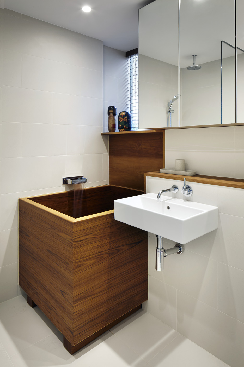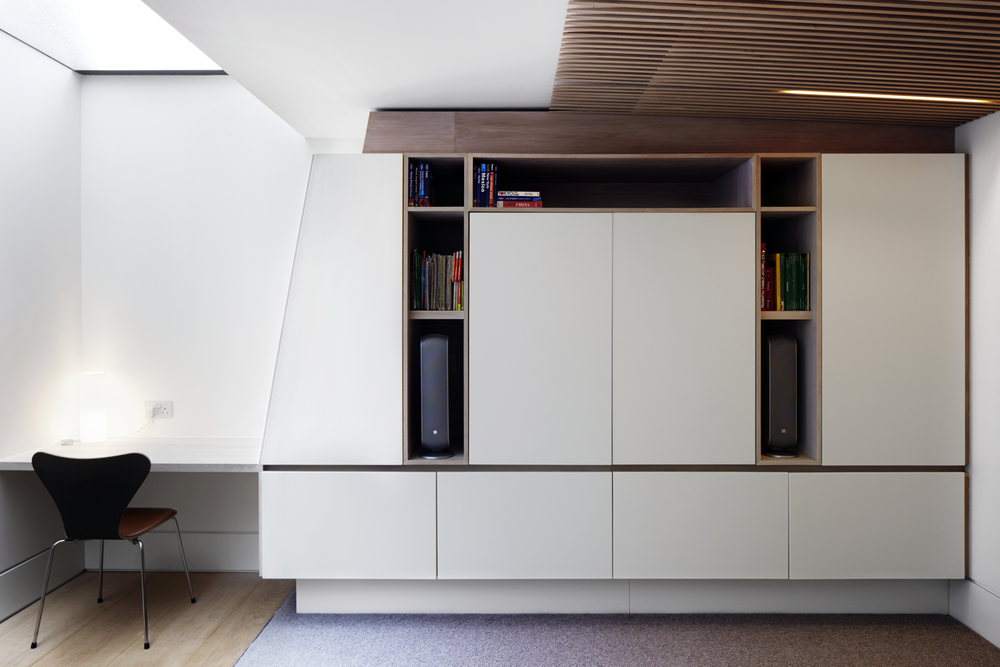 Teak mirrored cabinets compliment the client’s Teak Japanese bathtub. In the master-ensuite, natural Oak drawers with inset sprayed handle details reverse the aesthetic in the bedrooms.