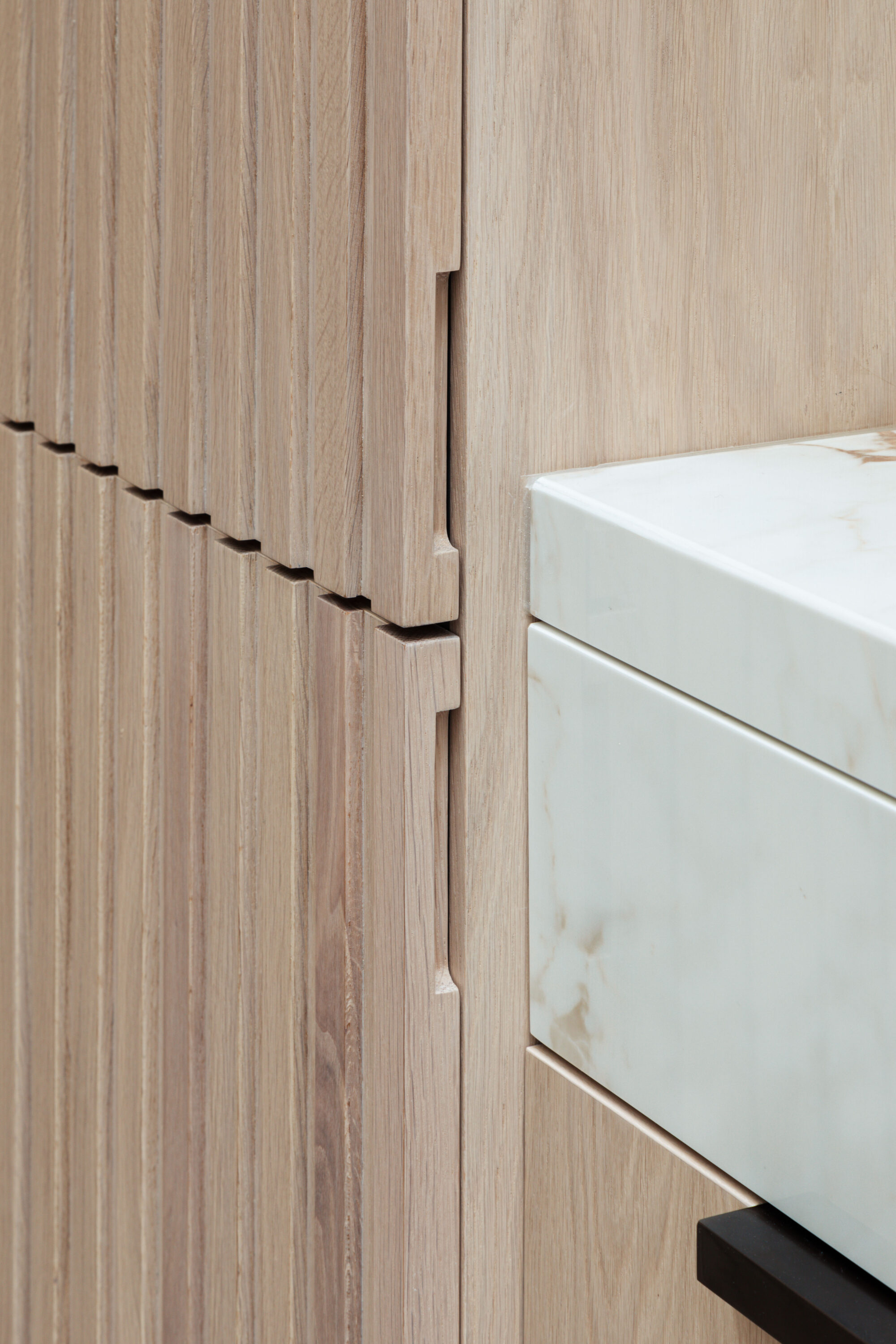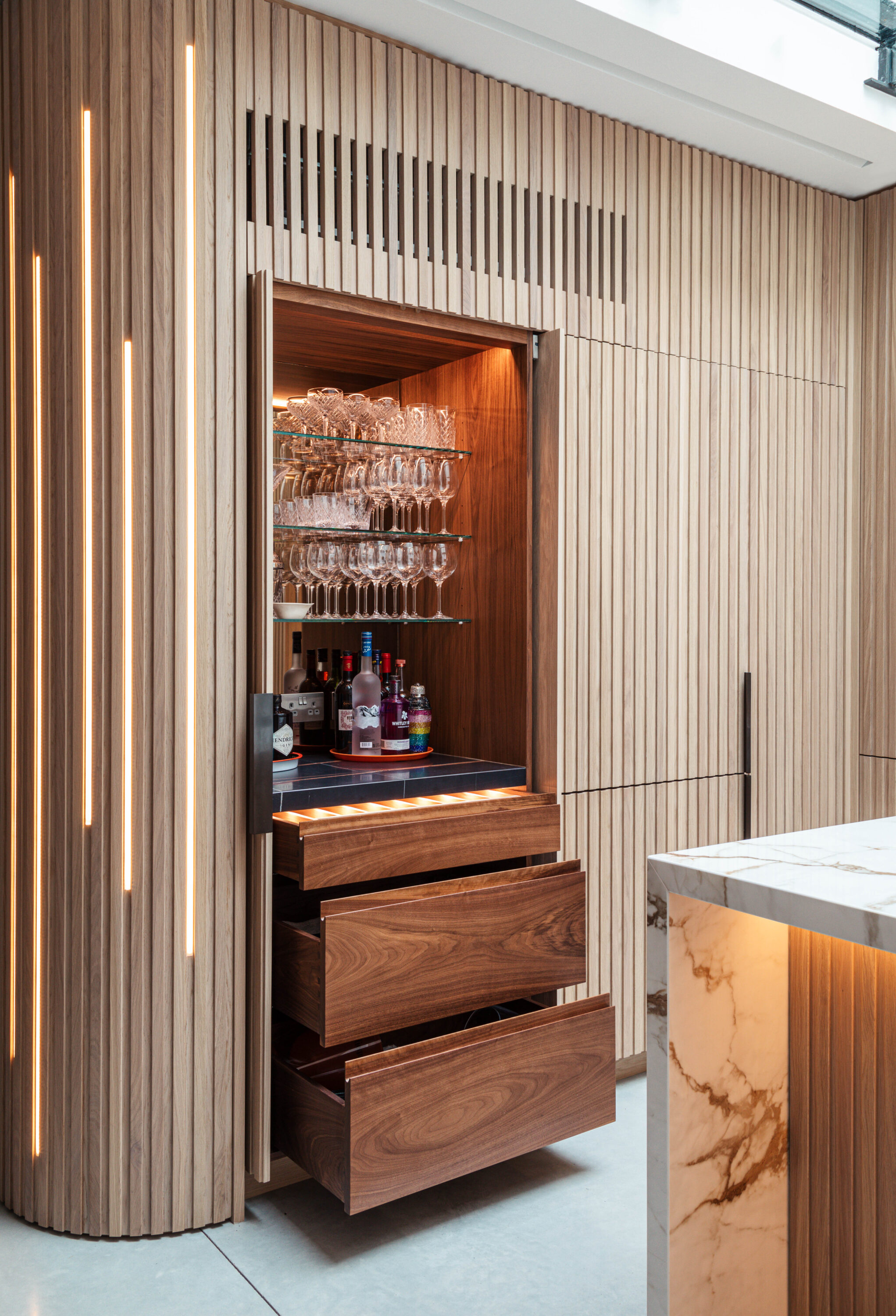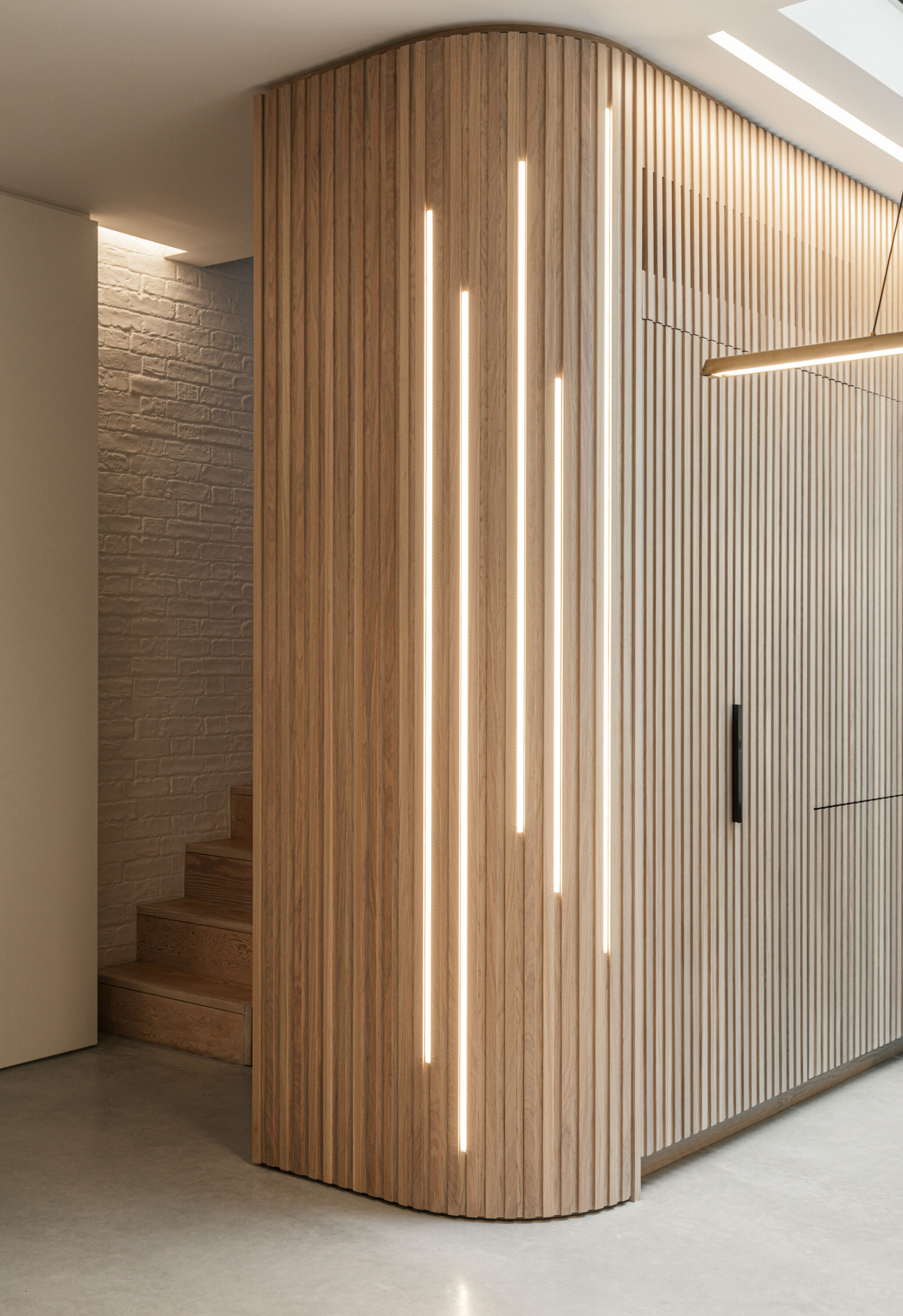 Vertical white washed Oak slats were used to create a play of light and shadow both when lit from daylight above and in the evening through the recessed LED lights embedded in the joinery.