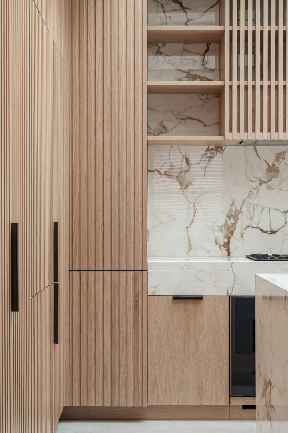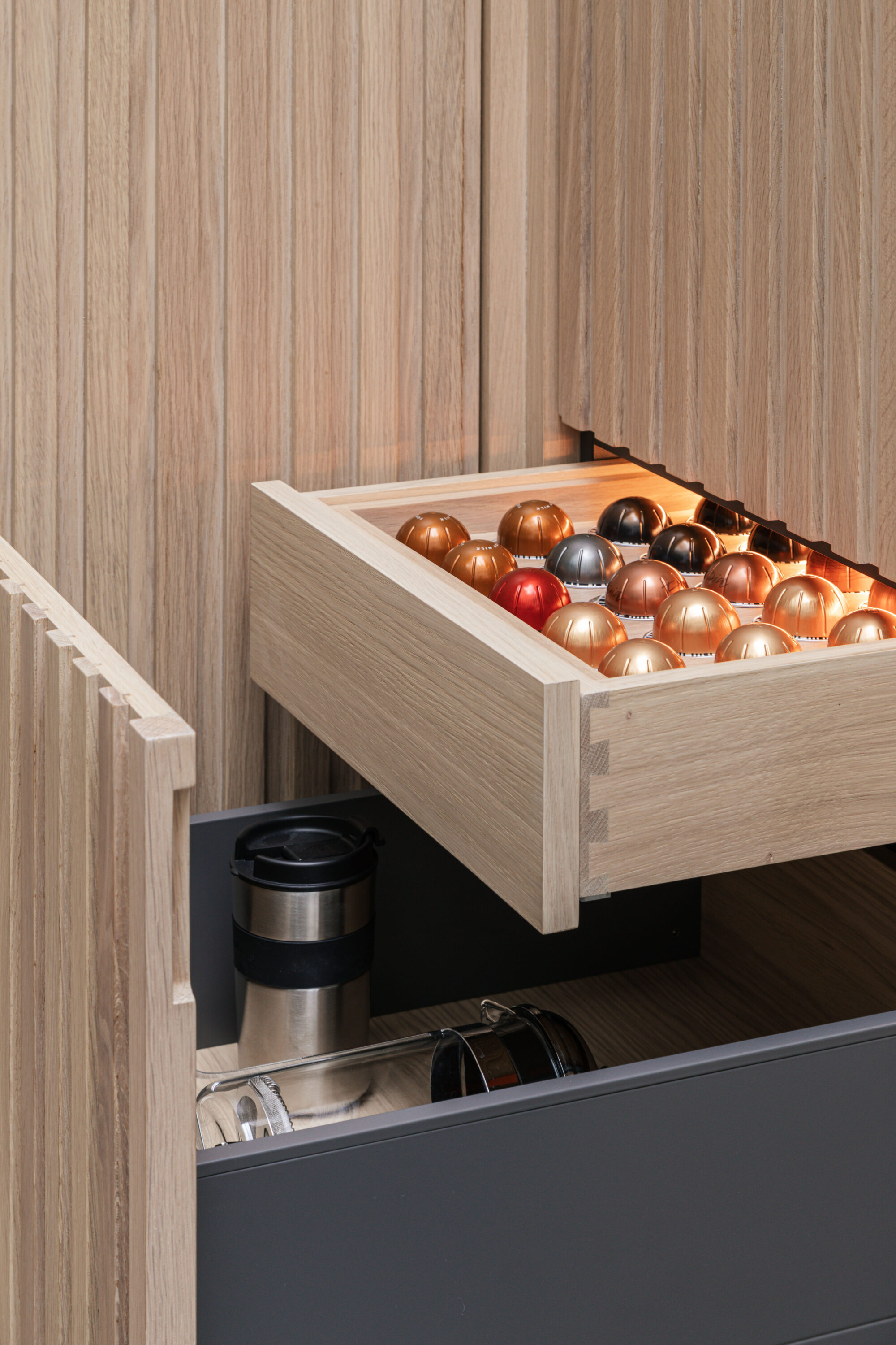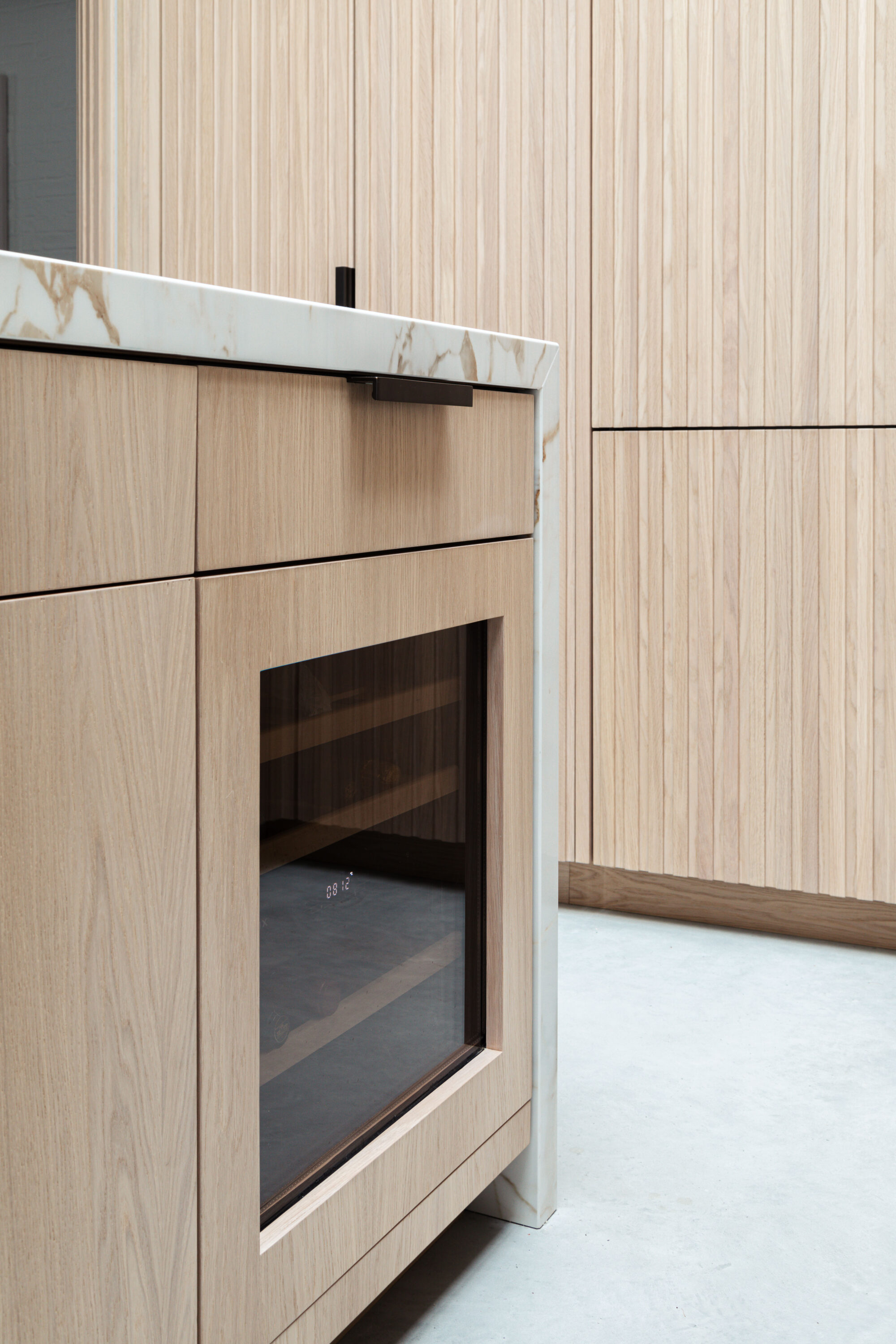 Vertical white washed Oak slats were used to create a play of light and shadow both when lit from daylight above and in the evening through the recessed LED lights embedded in the joinery.