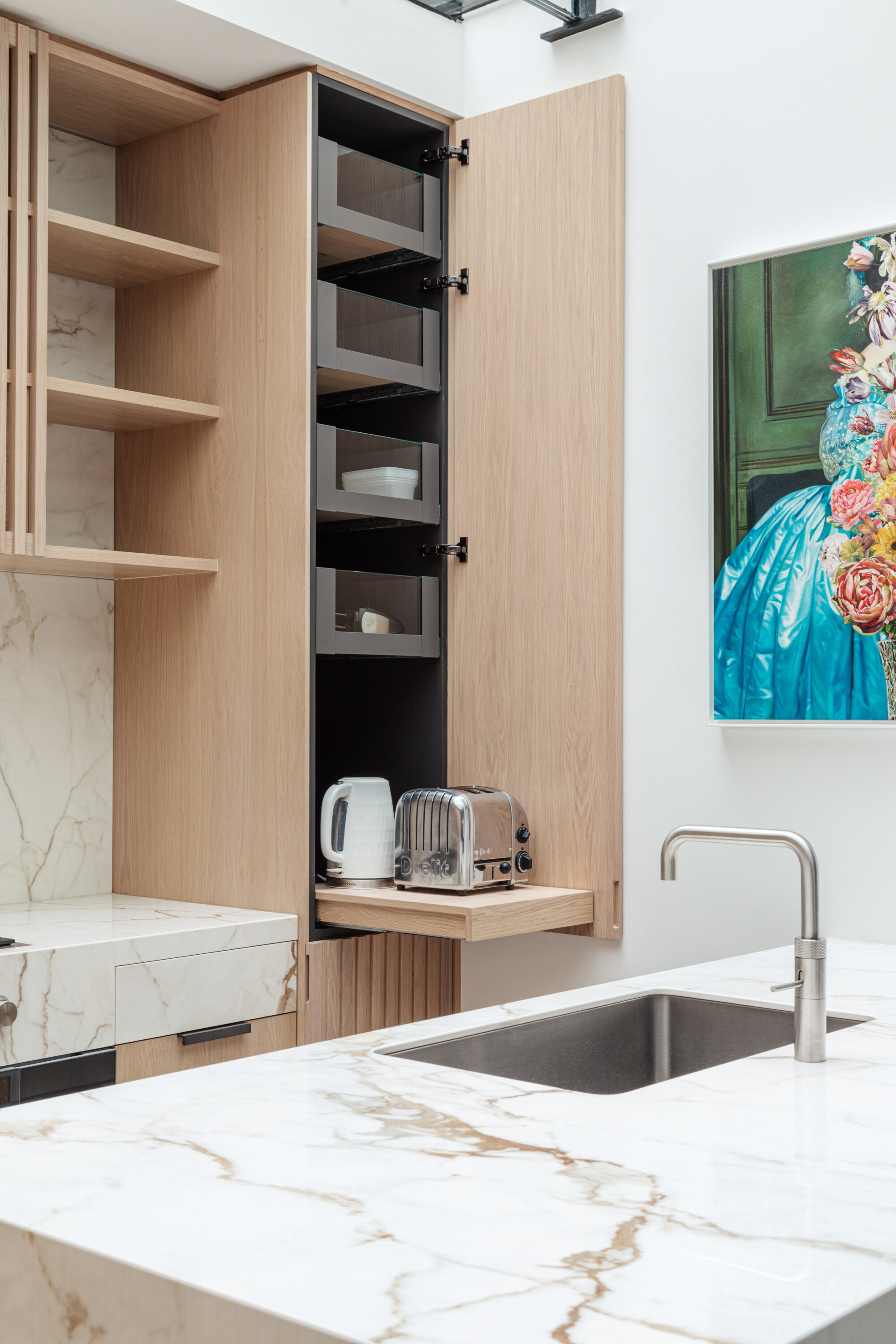 The concealed larder offers a contrasting pocket of luxurious dark American Black Walnut and Marazzi Saharra Noir stone, mirrored lining and glass shelving.