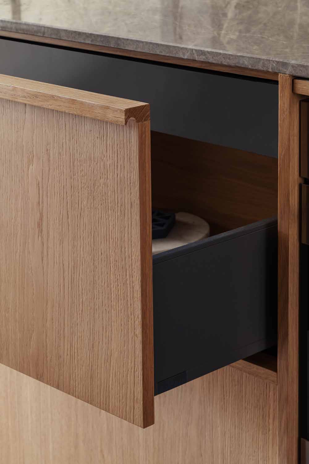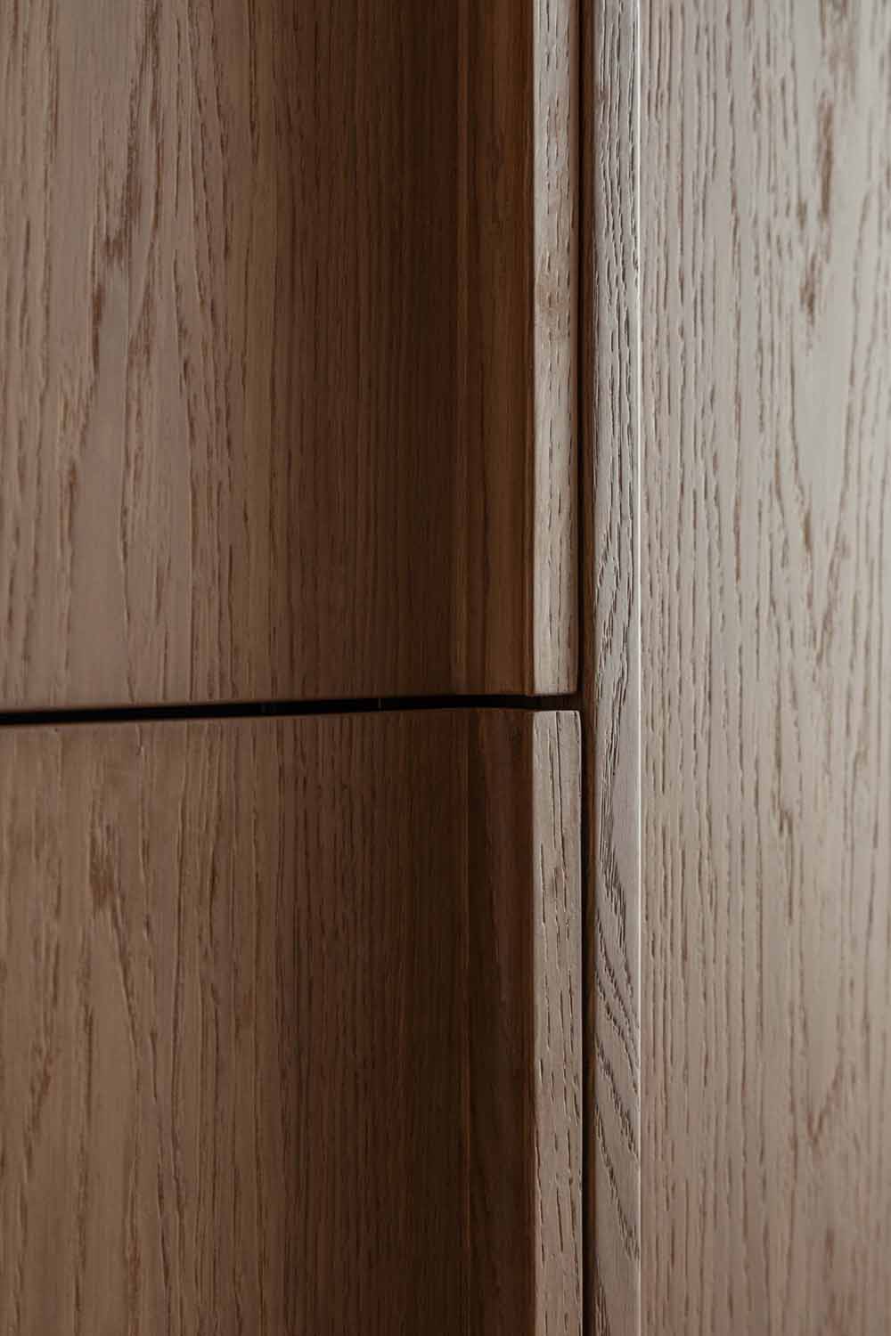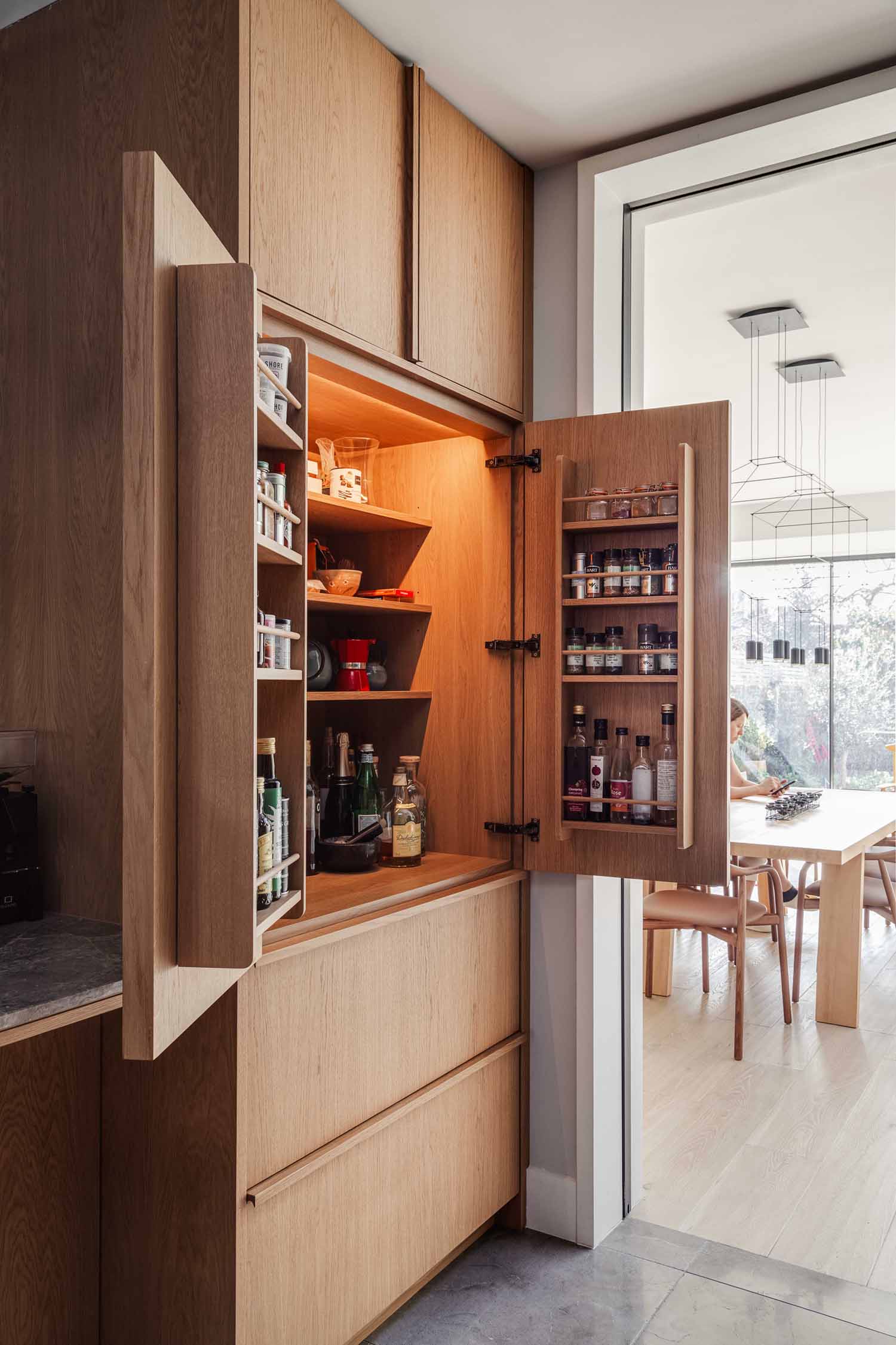 The warm glow emanating from the Oak larder cabinet truly reflects why a kitchen is known as the heart of the home. The custom spice racks ensure these are easily accessible and offer additional storage. It’s testament why a larder cabinet is integral to any contemporary kitchen.