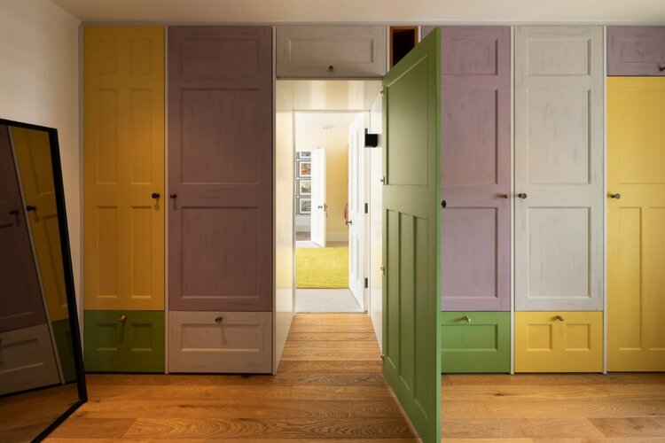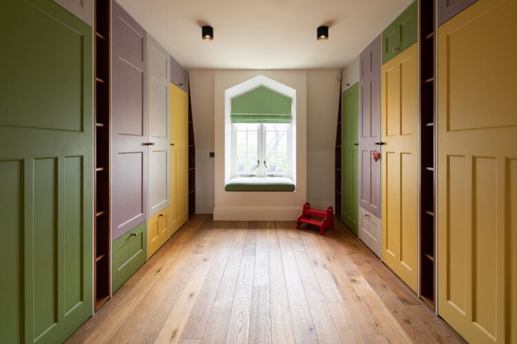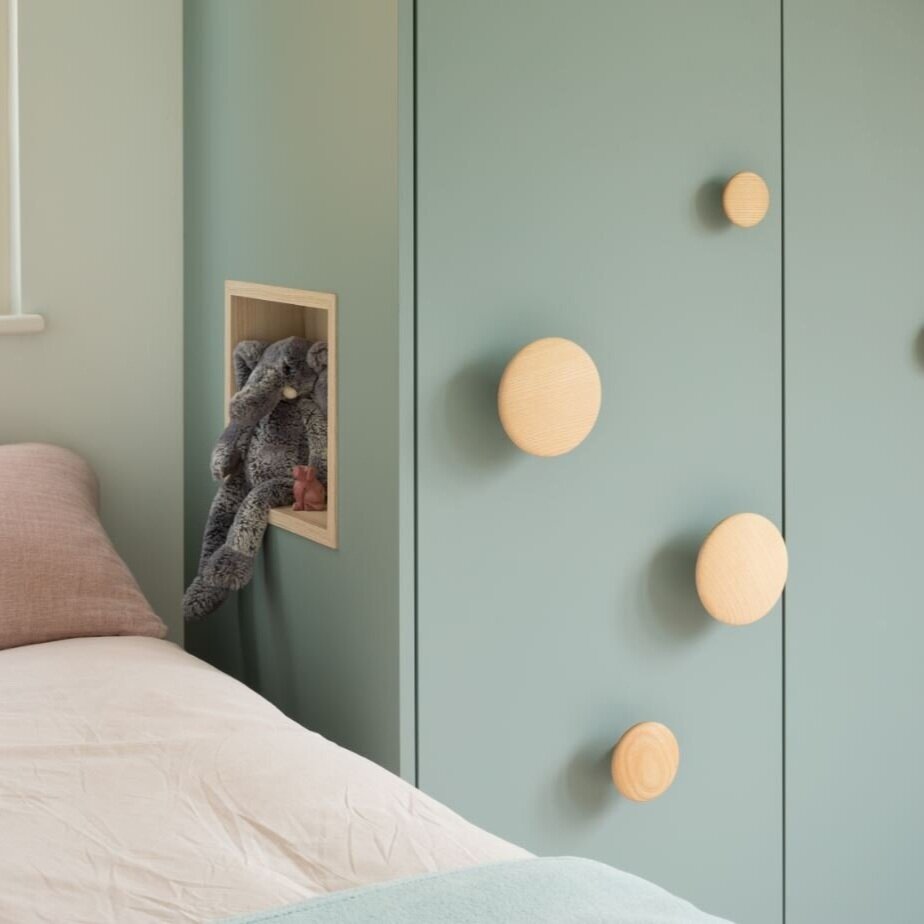 We used this for the fitted children’s wardrobes in both the Courtyard House and the Artist’s House. In the Courtyard House, we accented the blue with Navarra Ash Laminate exposed shelving, which is equally durable. We finished these playful wardrobes with Muuto Dots having dual functionality as both fun handles and hooks.