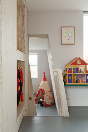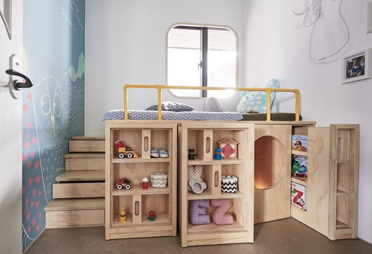 We love this cost effective storage solution that utilises Ply and simple detailing to maximise space in a small bedroom. The clever use of off-the-shelf components (such as the industrial pipe) keeps costs down, whilst powder coating them in bright colours adds a more luxurious yet youthful aesthetic. Not only does it provide plenty of space for toys, the playful cut-outs provide dens and snugs for exploring!