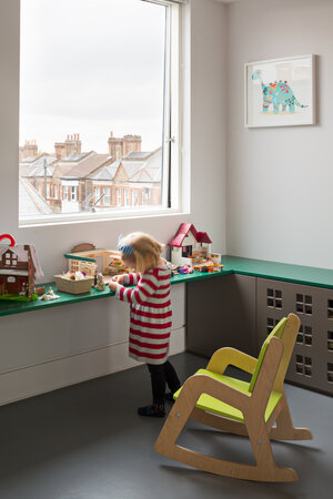 To create the cabinetry, we used Valchromat, which was a natural choice for this project, as not only does it come in a variety of fun colours, it’s through coloured, which allows for ultimate design flexibility in creating cuts & perforations through the panels. It’s also incredibly robust, a key consideration when selecting materials for children’s joinery. A street scene was created in the door fronts by cutting windows & doors using our CNC machine, adding whimsy and a secondary level of play to the overall space, by allowing the joinery to not only store toys, but become a toy in and of itself.