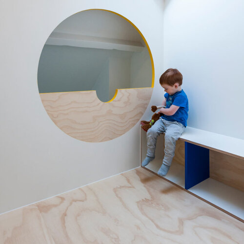 This amazing bunk bed goes above and beyond in considerations for child-use. Again utilising ply and pops of colour, not only does the playful form stimulate imagination, the small steps with built in low-level storage, all account for the joinery’s primary user.